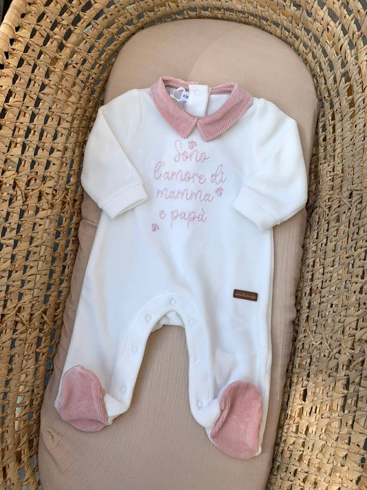 Tutina in ciniglia bianca e rosa Minibanda