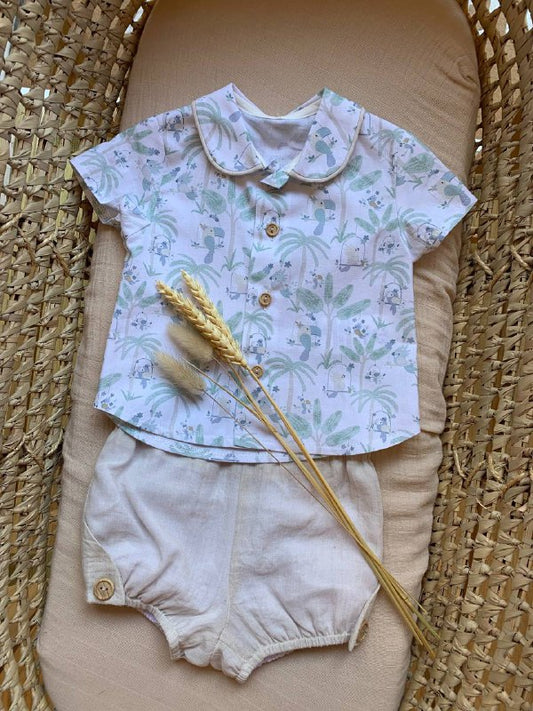 COMPLETO CAMICETTA IN LINO AZZURRO E SHORTS A QUADRETTI GIALLO DEL SUR se