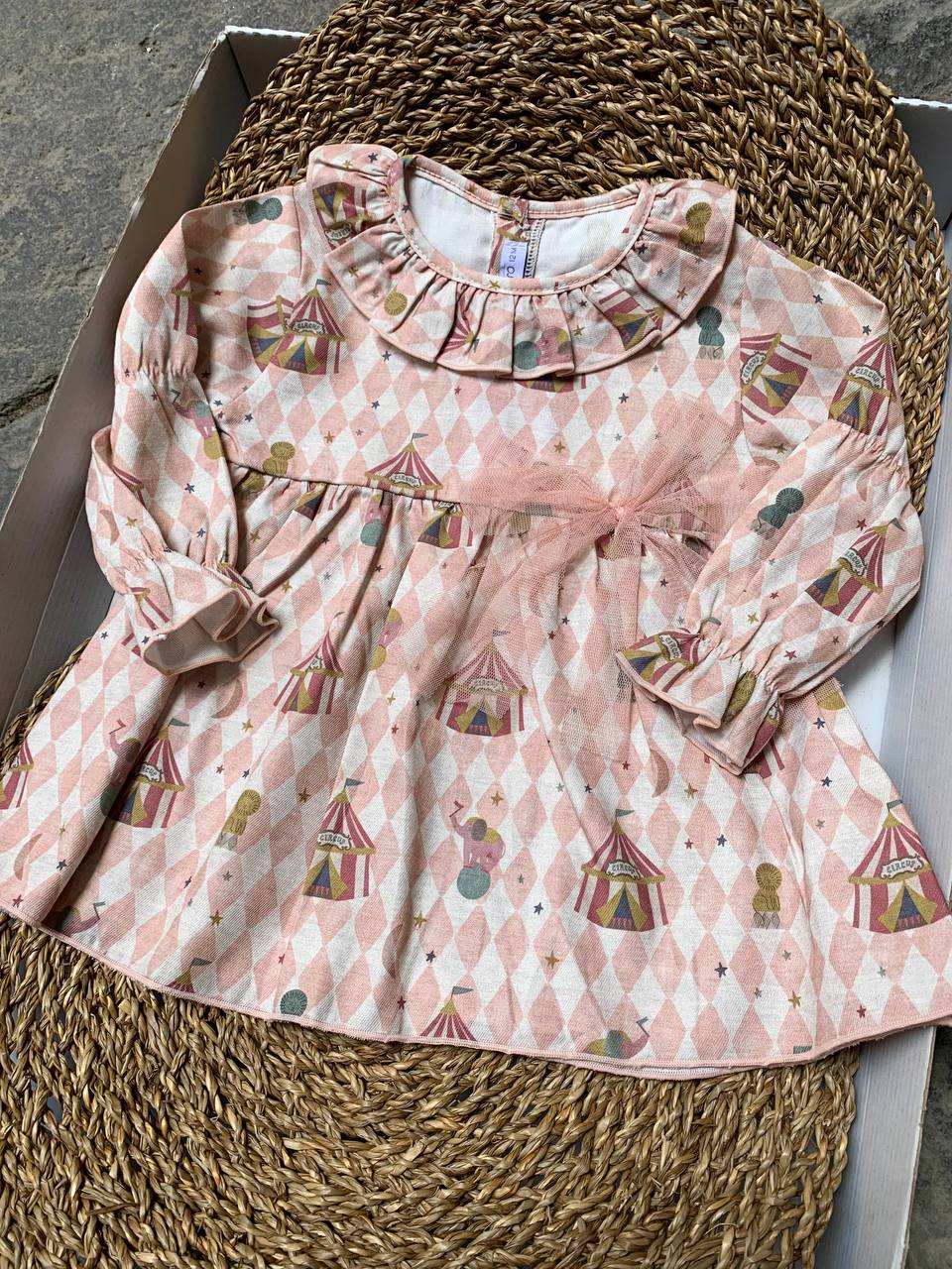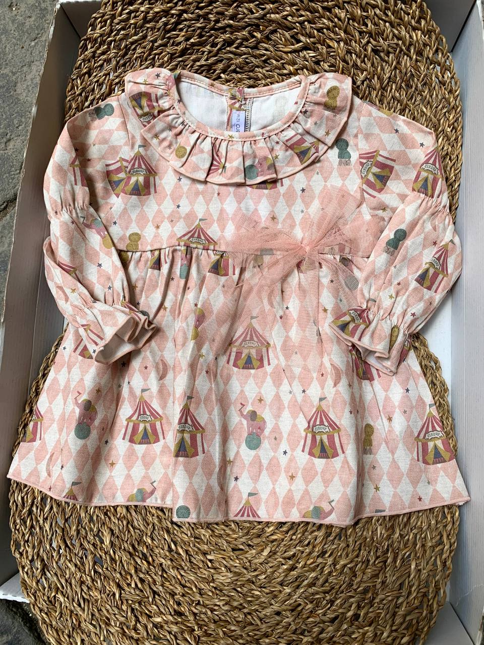 Aggiungi un tocco di allegria al guardaroba della tua neonata con l'abitino circo calamaro. Realizzato in tessuto morbido e confortevole, questo abitino presenta un design colorato e divertente che stimolerà la fantasia della tua bambina. Perfetto per ogni occasione, è anche facile da indossare.