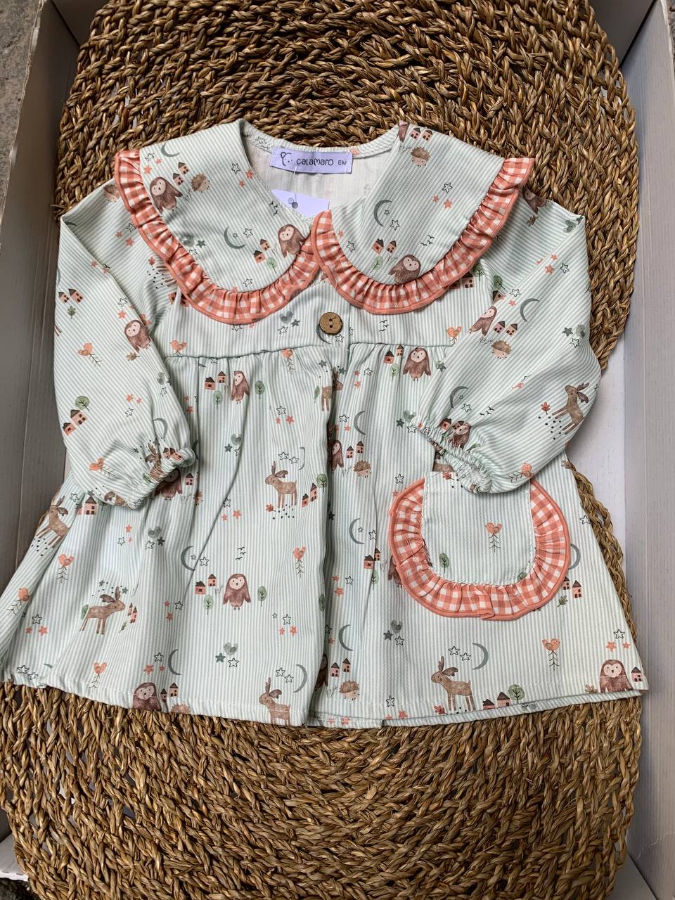 Questo abitino FORESTA CALAMARO è perfetto per neonate. Realizzato con un motivo a tema forestale, è ideale per le passeggiate primaverili in famiglia. Sia comodo che adorabile, questo abitino porterà un tocco di natura alla tua piccola.