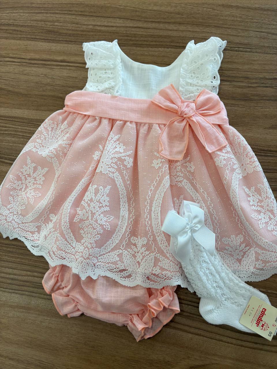 Abitino pesca e bianco con pizzo San Gallo, progettato per bebè, offre una combinazione di eleganza e comfort. Realizzato con materiali di alta qualità, garantisce una vestibilità morbida. Il design accattivante è ideale per occasioni speciali, armonizzando estetica e funzionalità.