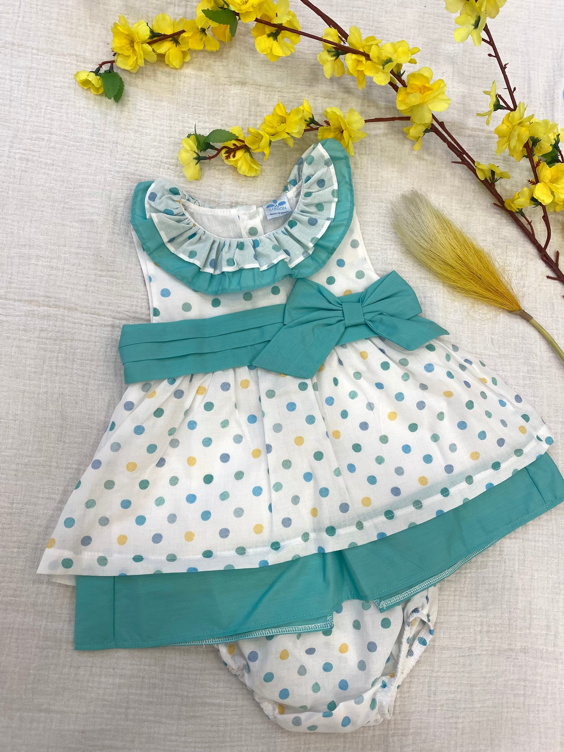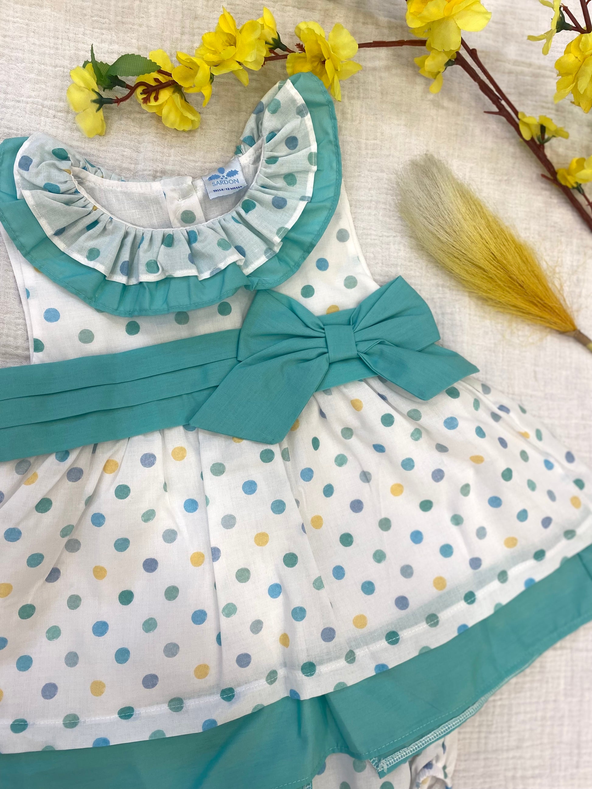 Abitino Sardon fantasia pois con culotte, colletto rouche e fiocco verdeÂ