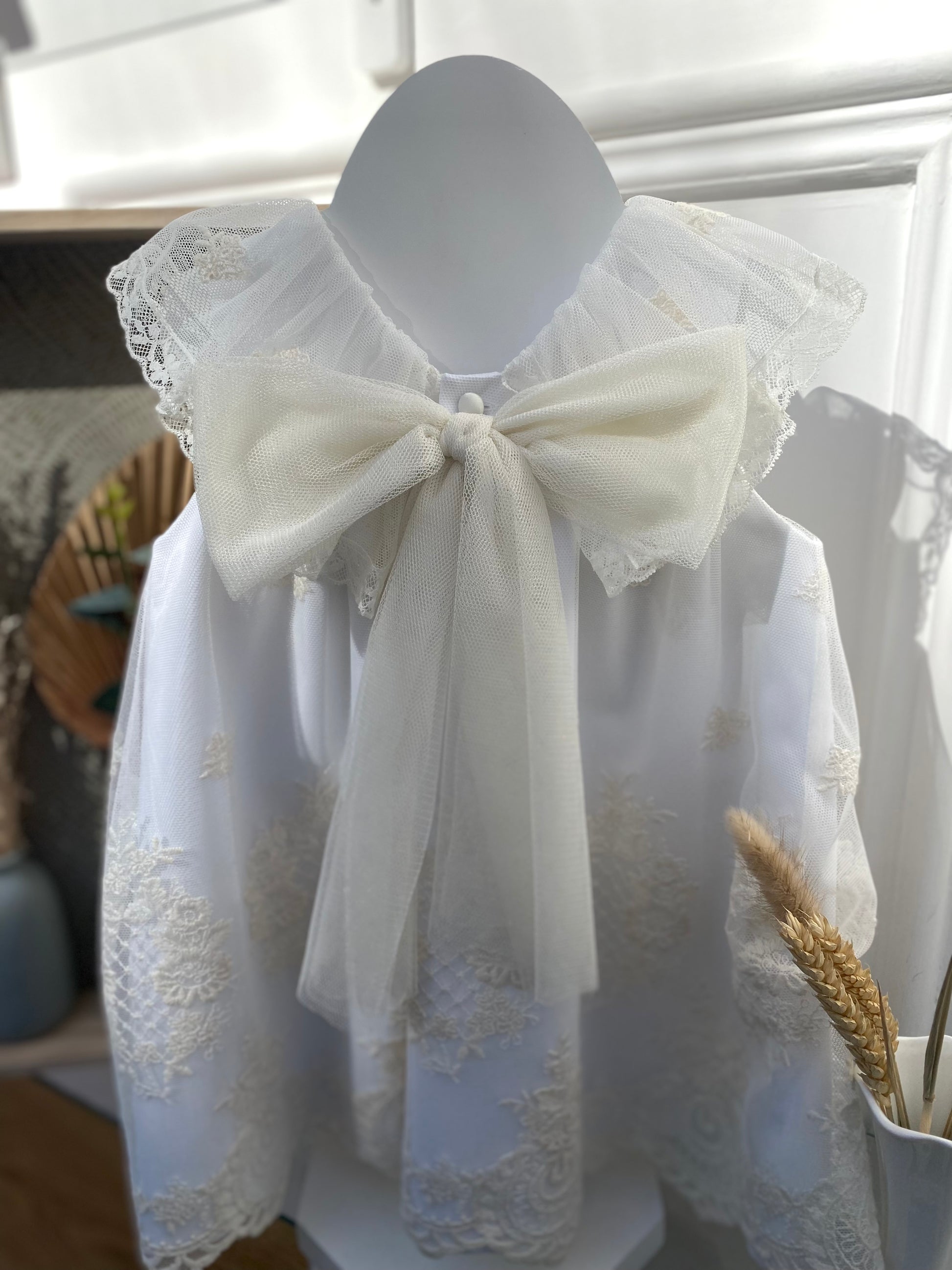 Abito bianco con ricami in avorio e fioccone sul retro