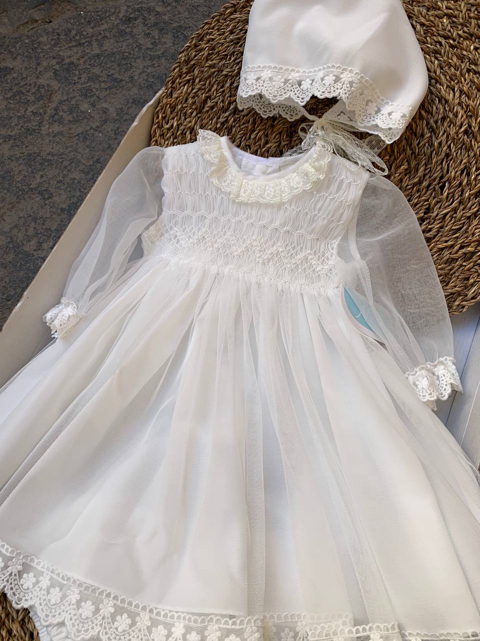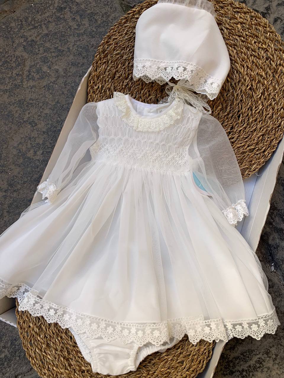 "Con l'abito battesimale Armonia Bianca per neonate, la tua bambina sarà ancora più bella e graziosa il giorno del suo battesimo. Realizzato in delicato tessuto bianco, questo abito è accompagnato da una cuffia coordinata per un look armonioso e raffinato. Lascia che la tua piccola si presenti al mondo in grande stile con questo elegante abito da battesimo."