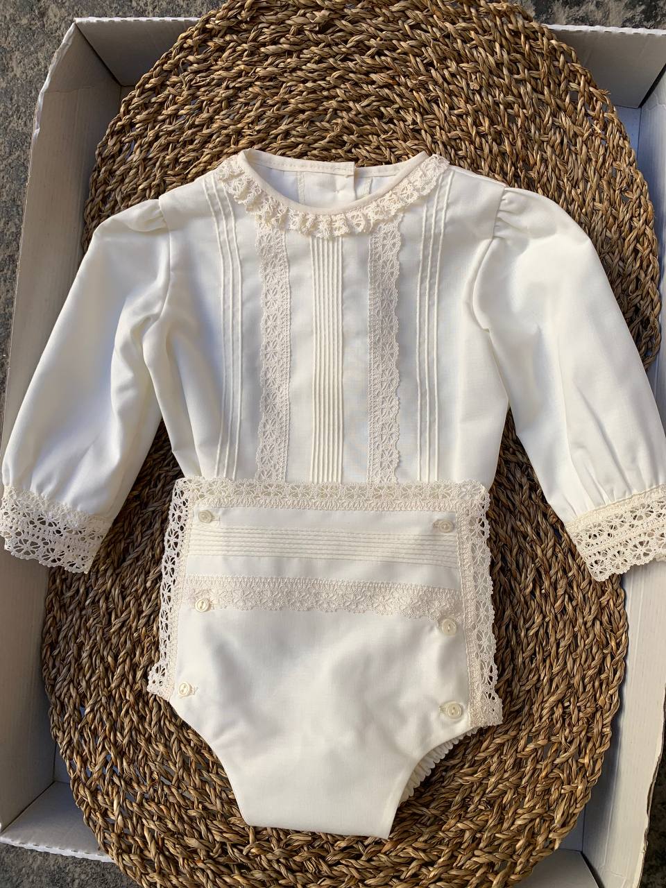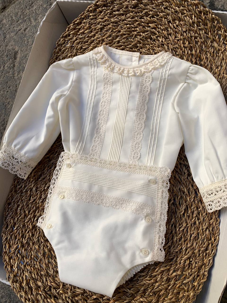 Cerimonia battesimale di alta qualità per neonati, realizzata in tessuto BATISTA CHARO. Con questo abito, il tuo bambino sarà vestito in modo elegante e confortevole durante la celebrazione del battesimo. Garantisce un aspetto impeccabile e un'esperienza piacevole per tutta la famiglia.