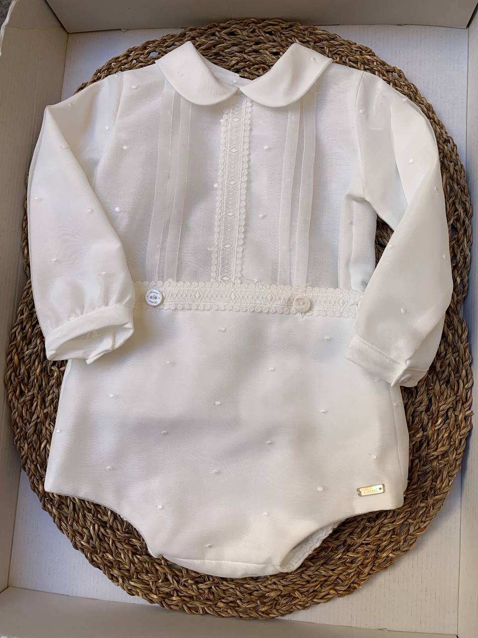 Questo Abito Battesimale Bianco con pois è perfetto per il tuo neonato. Realizzato in morbido tessuto, garantirà il massimo comfort al tuo bambino durante la cerimonia. Il suo design elegante con i pois bianchi lo rende un capo adatto per ogni occasione speciale. Vestirai il tuo piccolo con stile e comodità .