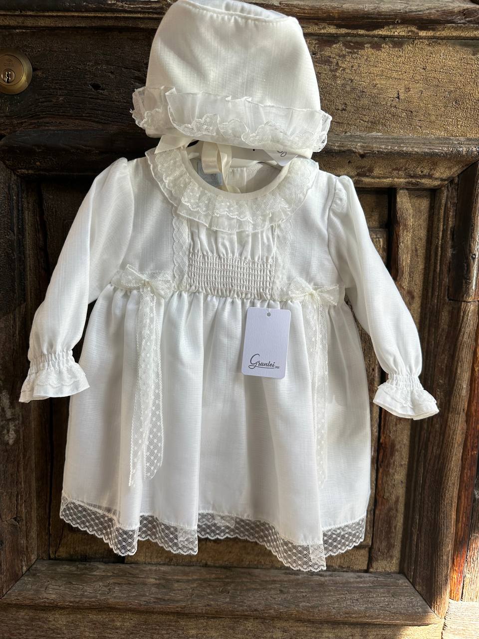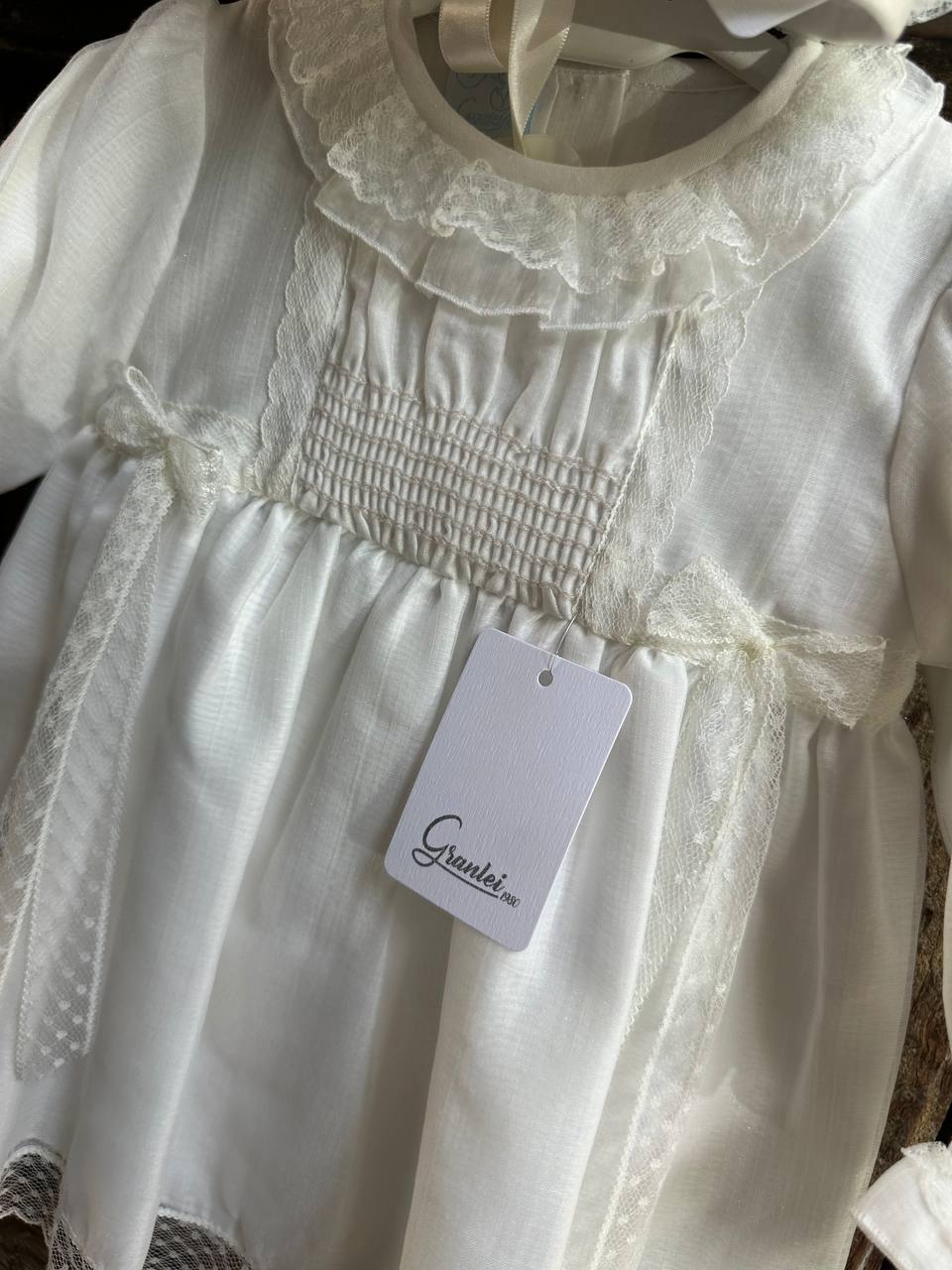 Questo elegante abito battesimale Granlei con cuffia è perfetto per la tua neonata. Realizzato con materiali di alta qualità , offre comfort e stile per il tuo evento speciale. Con il suo design raffinato e dettagli delicati, questo abito è il regalo ideale per la tua piccola principessa.