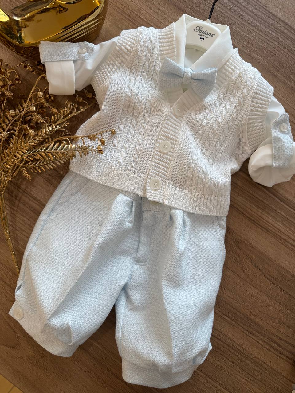 L'Abito Battesimale Lord AZZURRO Gastone è progettato per occasioni speciali, includendo un gilet in filo con treccia, una camicia, bermuda in stile inglese a effetto palloncino , bretelle e papillon. Questo abito combina eleganza e comfort, ideale per un battesimo con uno stile raffinato.