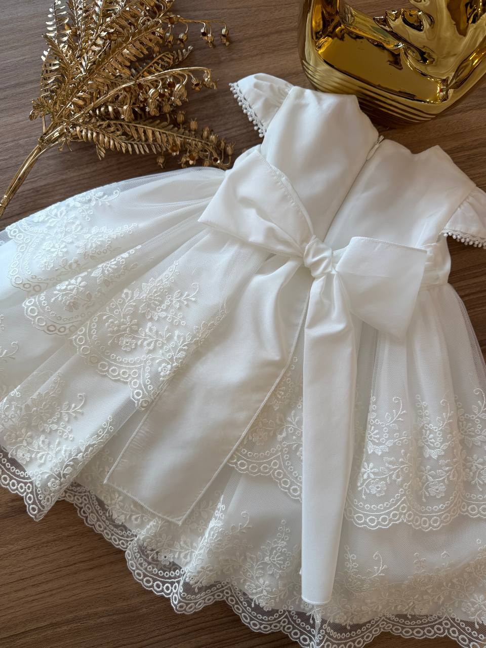 Questo delicato abito battesimale in panna è perfetto per il giorno più speciale della vostra neonata. Realizzato con dettagli raffinati con roselline in teto e tatta, combina eleganza tradizionale e comfort. Il tessuto morbido e la lavorazione accurata garantiscono una vestibilità impeccabile durante la cerimonia. Un capo senza tempo che diventerà un ricordo indimenticabile e potrà essere conservato come abito prezioso di famiglia.