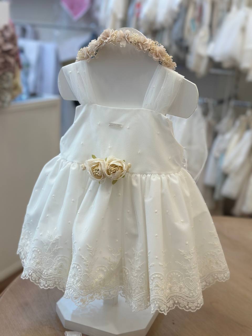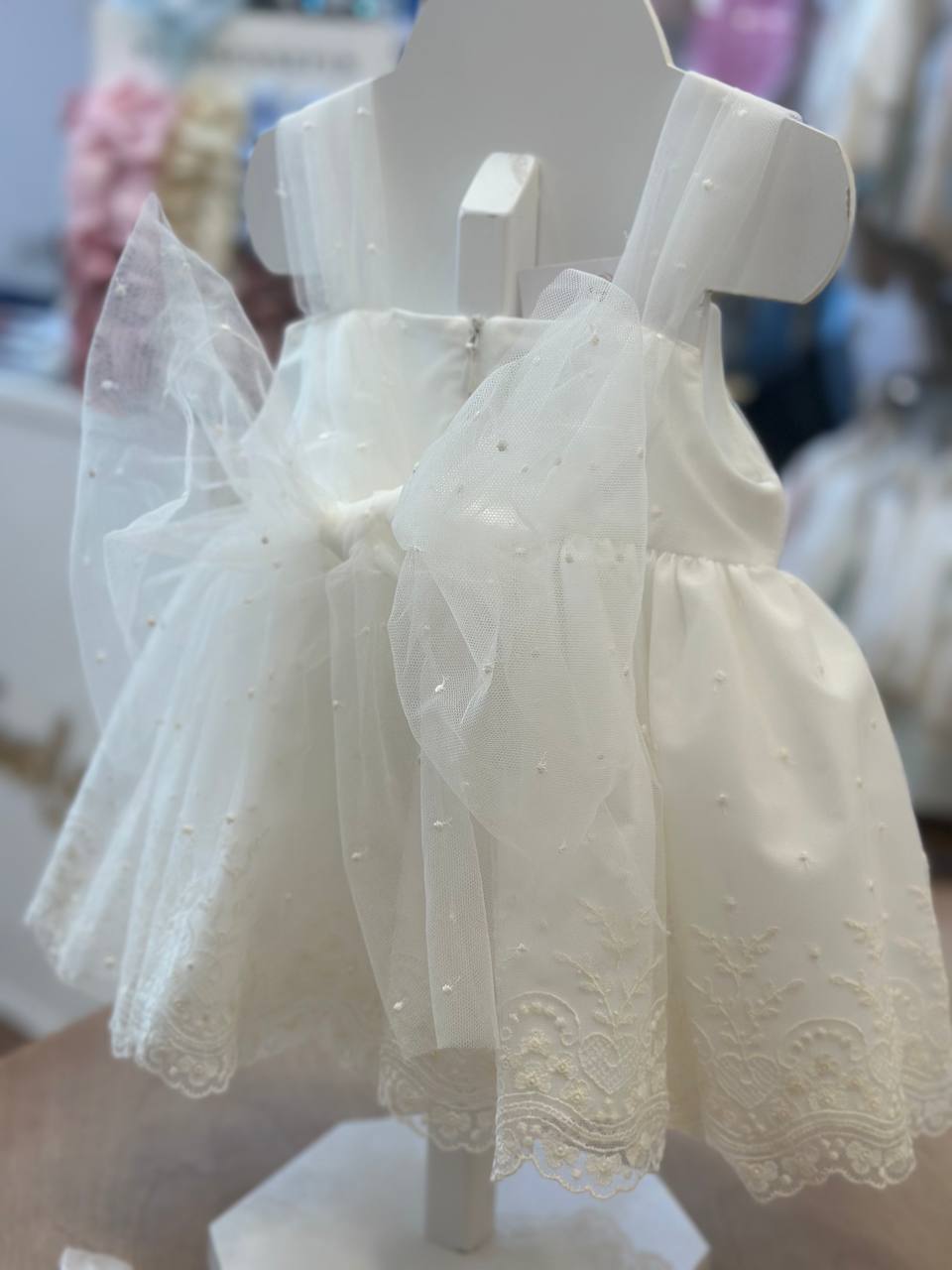 Esalta la bellezza della tua bimba con questo stupendo abito. Realizzato in morbido e leggero tessuto bianco, impreziosito da un grazioso fiore e fiocco sul retro, questo abito aggiunge un tocco di eleganza alla tua bimba, perfetto per un occasione importante.