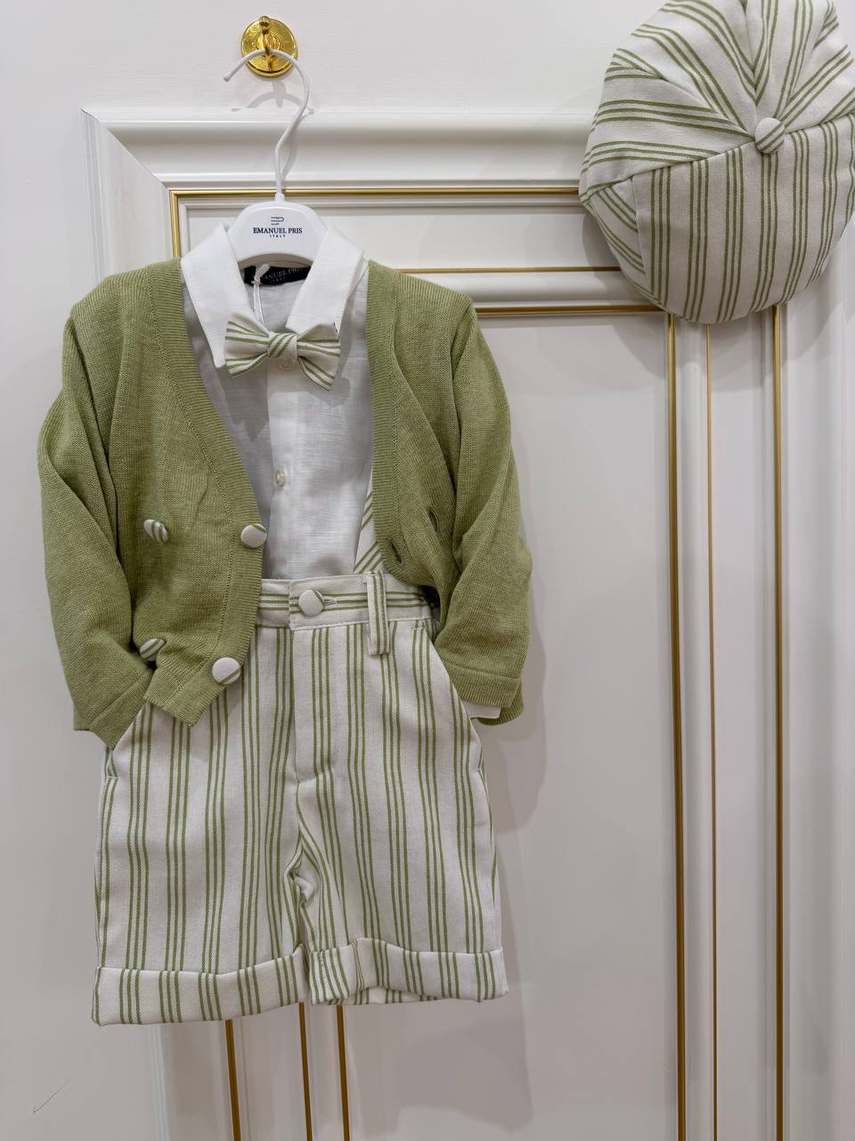 Vesti il tuo neonato con stile per le occasioni più importanti. L'abito da cerimonia Emanuel Pris unisce la purezza del bianco con accenti verde che catturano l'eleganza e la delicatezza. COMPRENDE LA Salopette ,camicia ,cardigan,papillon e coppola .Realizzato con tessuti pregiati e confortevoli, assicura libertà di movimento durante battesimi, matrimoni e festeggiamenti. I dettagli raffinati e la qualità costruttiva lo rendono un capo destinato a durare nel tempo e a essere tramandato. Scegli la perfezione per i momenti che contano davvero.