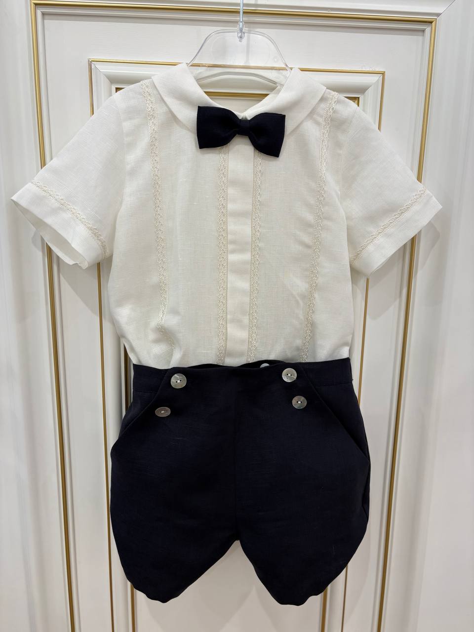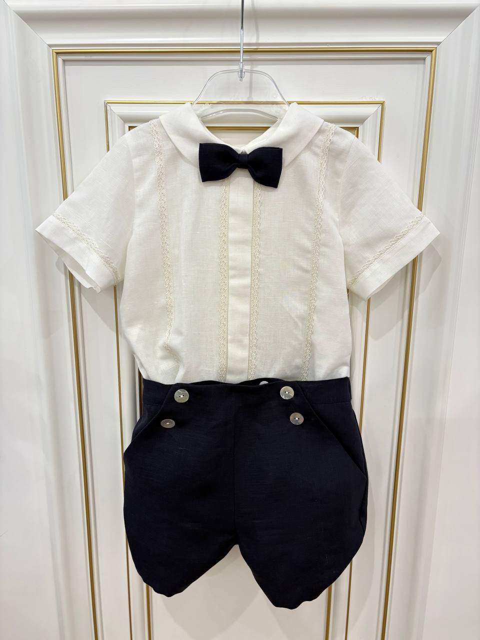 L'Abito(PAGGETTO)CERIMONIA BLU NOTTE PONTO POR PONTO è un completo per bambini progettato per eventi formali. Realizzato in un elegante blu notte, offre un look sofisticato e adatto a cerimonie. La qualità dei materiali garantisce comfort e durata, essenziali per le esigenze dei più piccoli durante le celebrazioni.