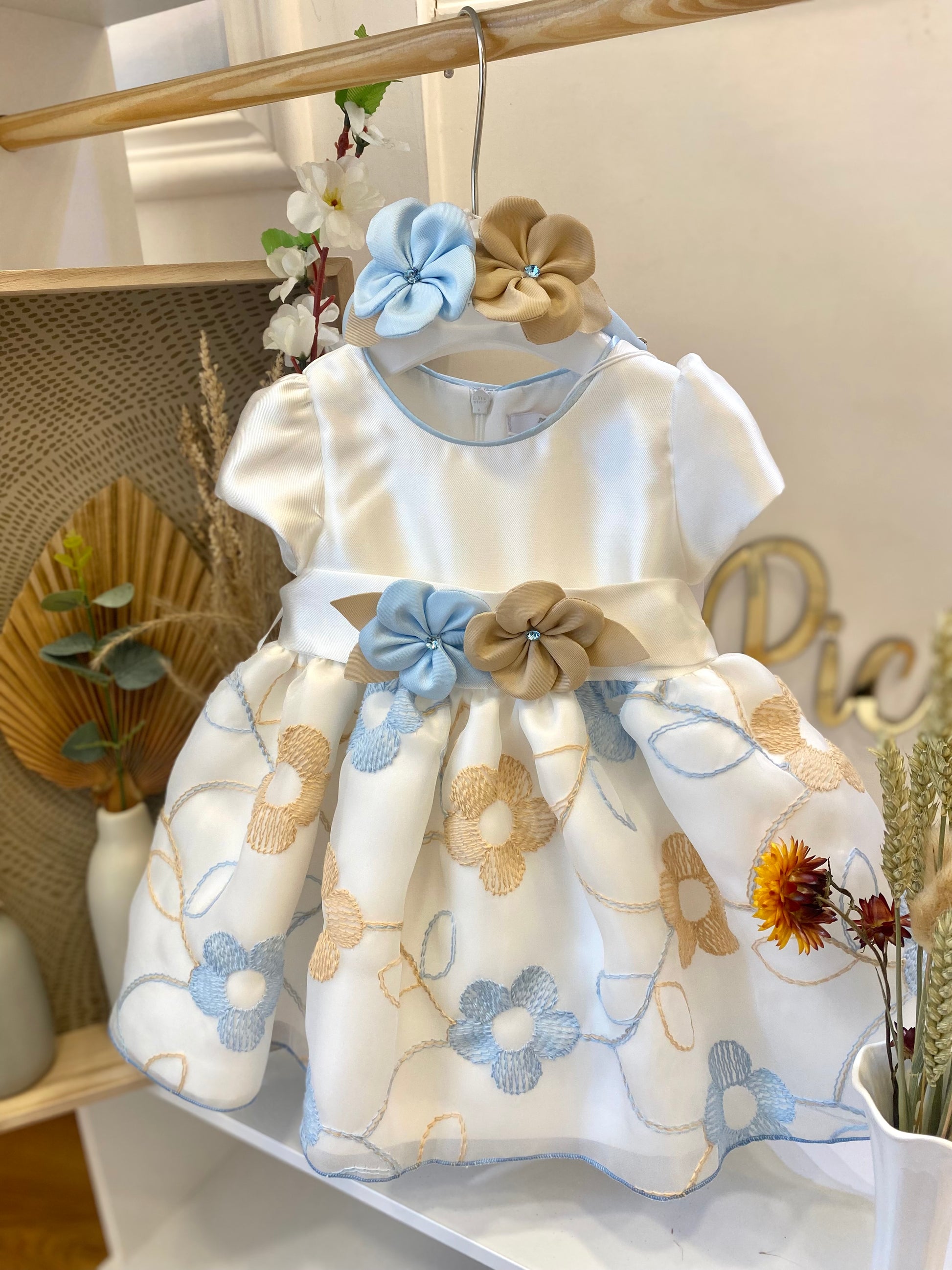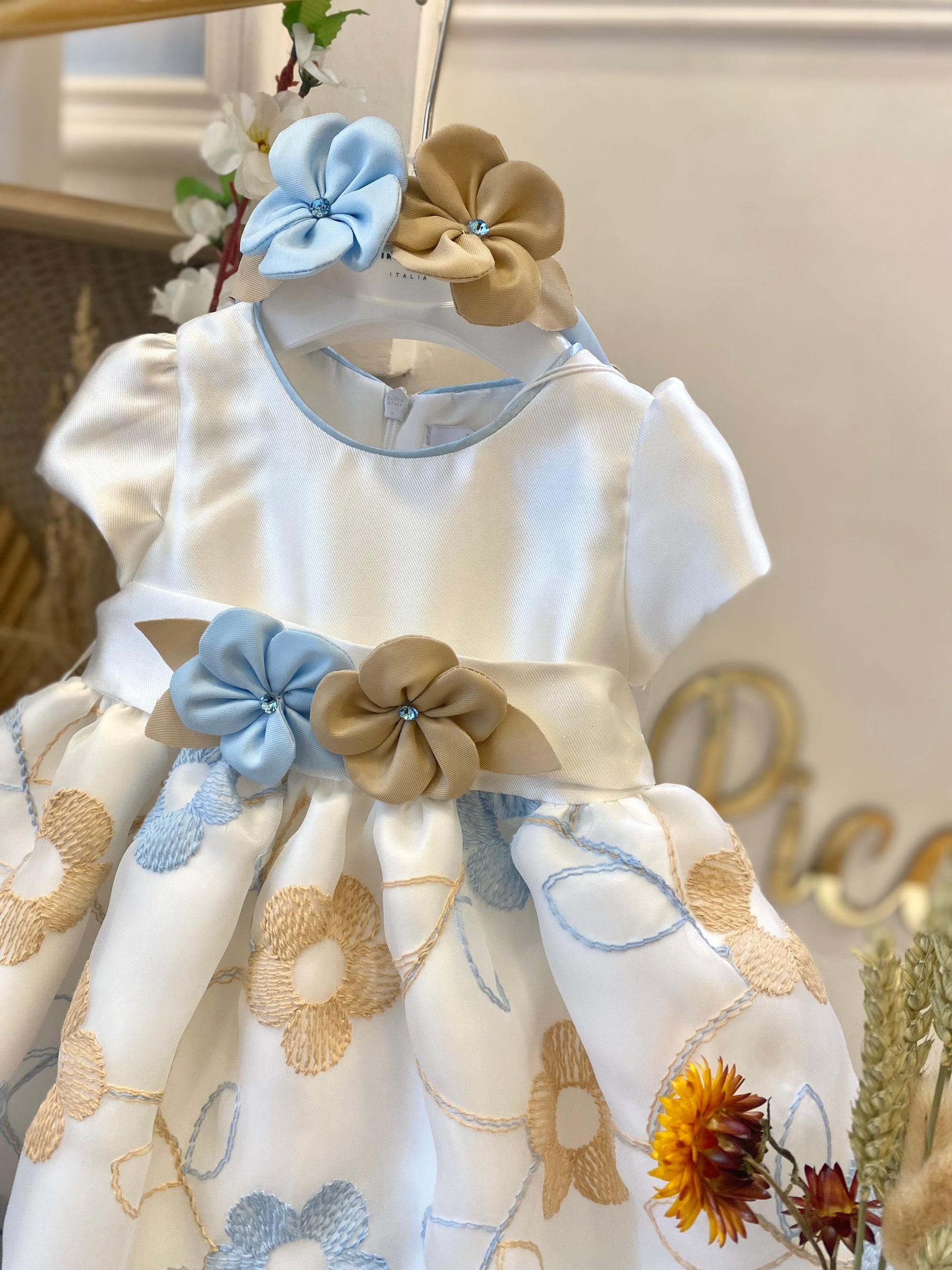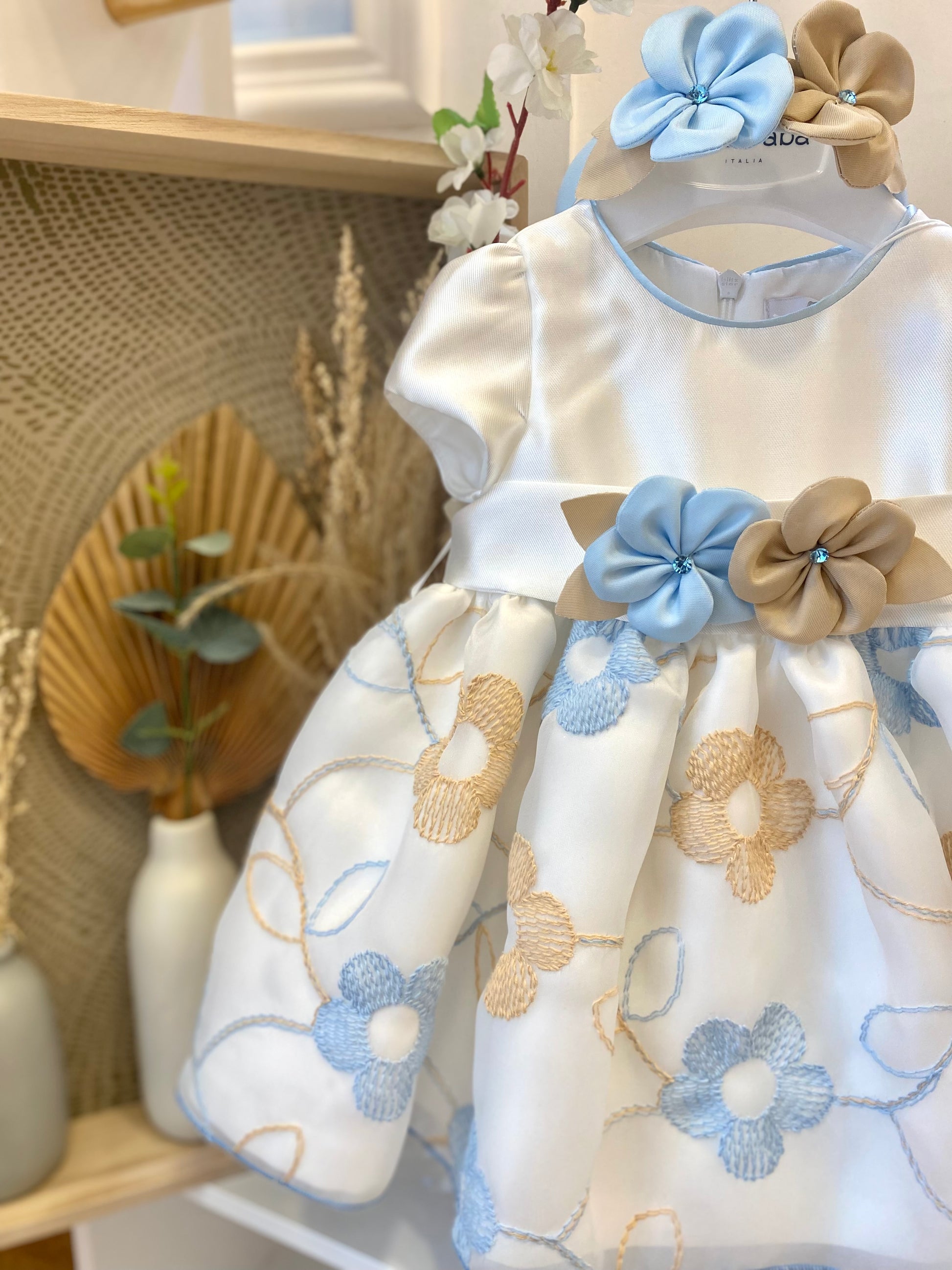 "Immancabilmente primaverile! L'abito fiorellini ha una gonnellina con ricami fiori chr per la tua bimba sarà un tocco di freschezza e allegra eleganza. La cinta in vita presenta una spilla con degli strass sul fiore e un fiocco nel retro.