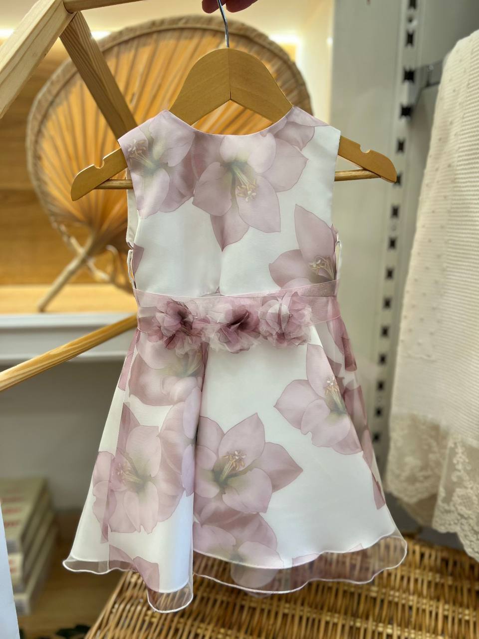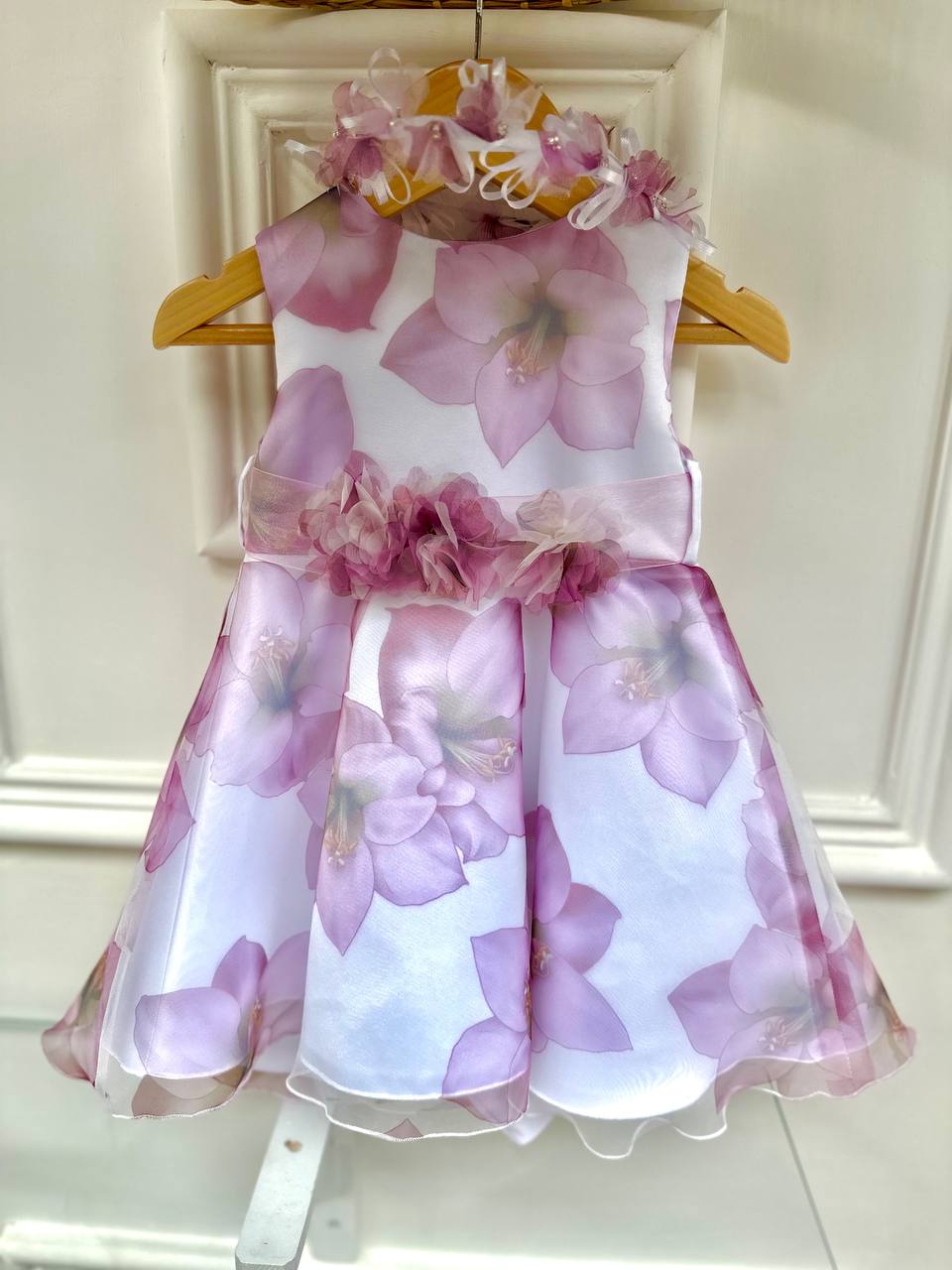 Abito cerimonia con decorazioni di fiori sfumati nella tonalita del glicine, cintura in fiori