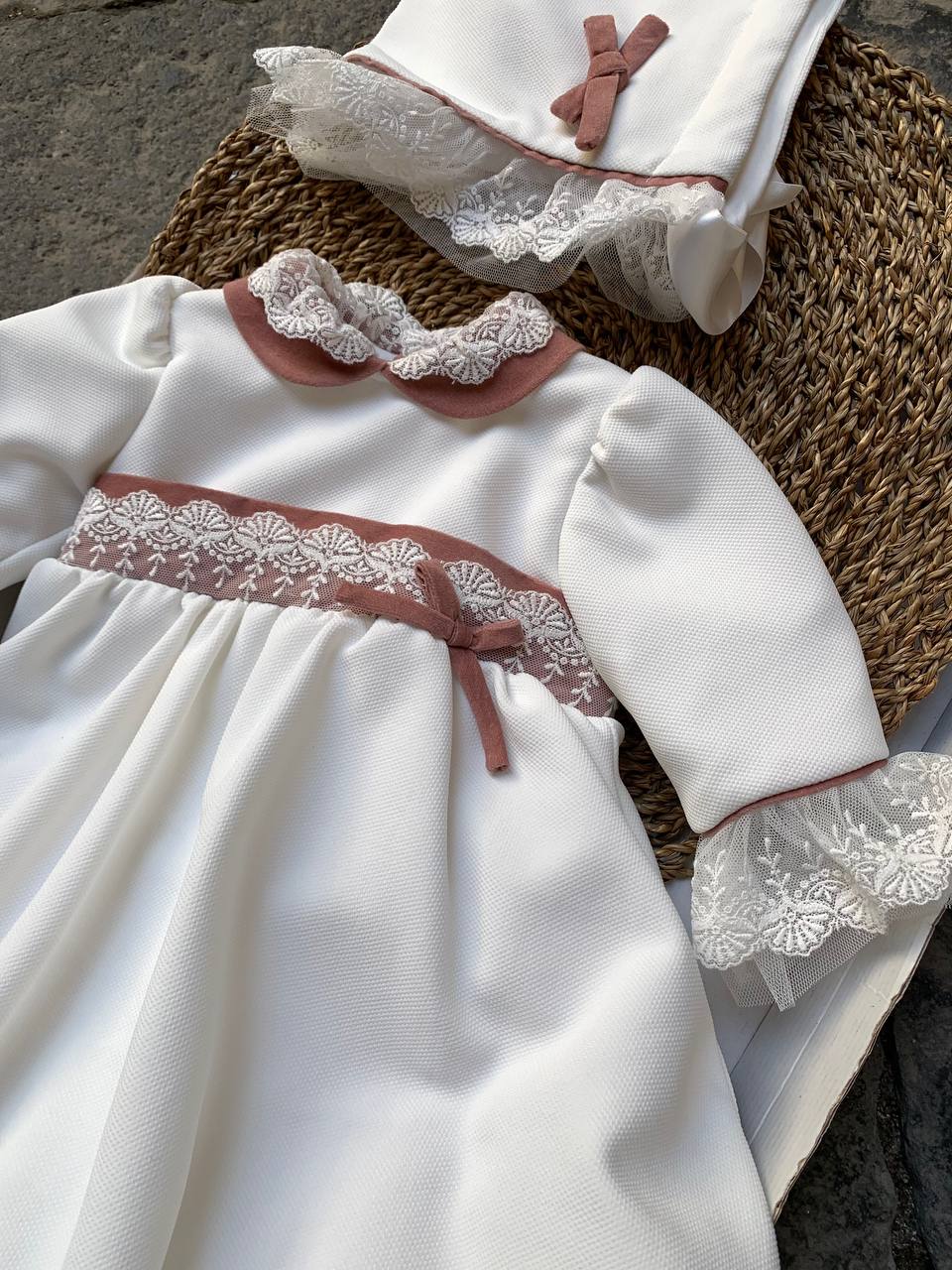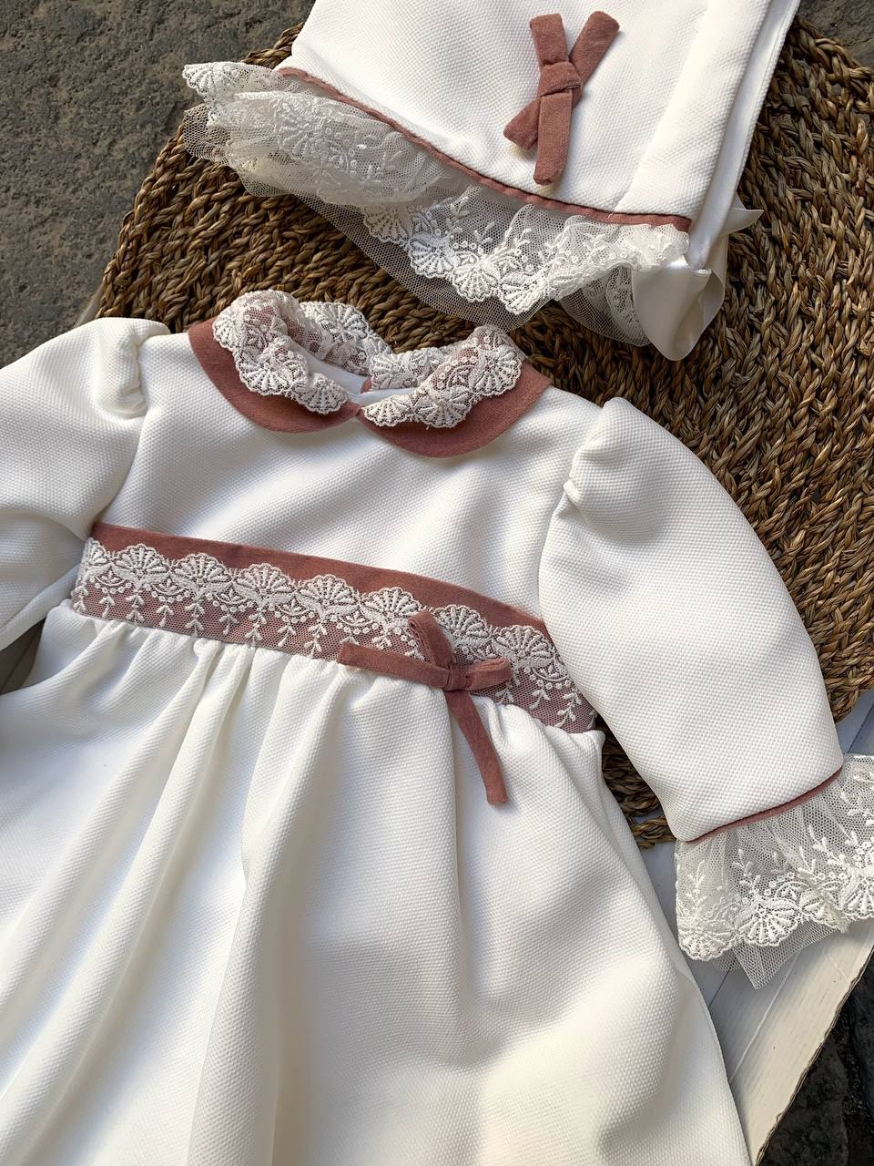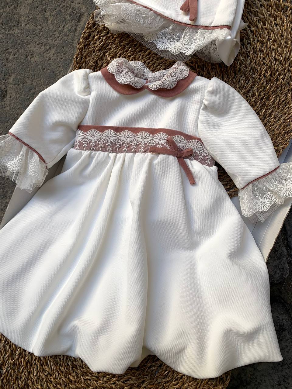 Scelga l'eleganza dell'abito RICAMATO ROSA ANTICO PONTO PER PONTO per la tua neonata. Il delicato rosa antico e i dettagli ricamati a mano rendono questo abito perfetto per le occasioni speciali. Rivela il tuo buon gusto scegliendo questo capo ricercato e fatto con cura.ABBINATA LA CUFFIETTA.