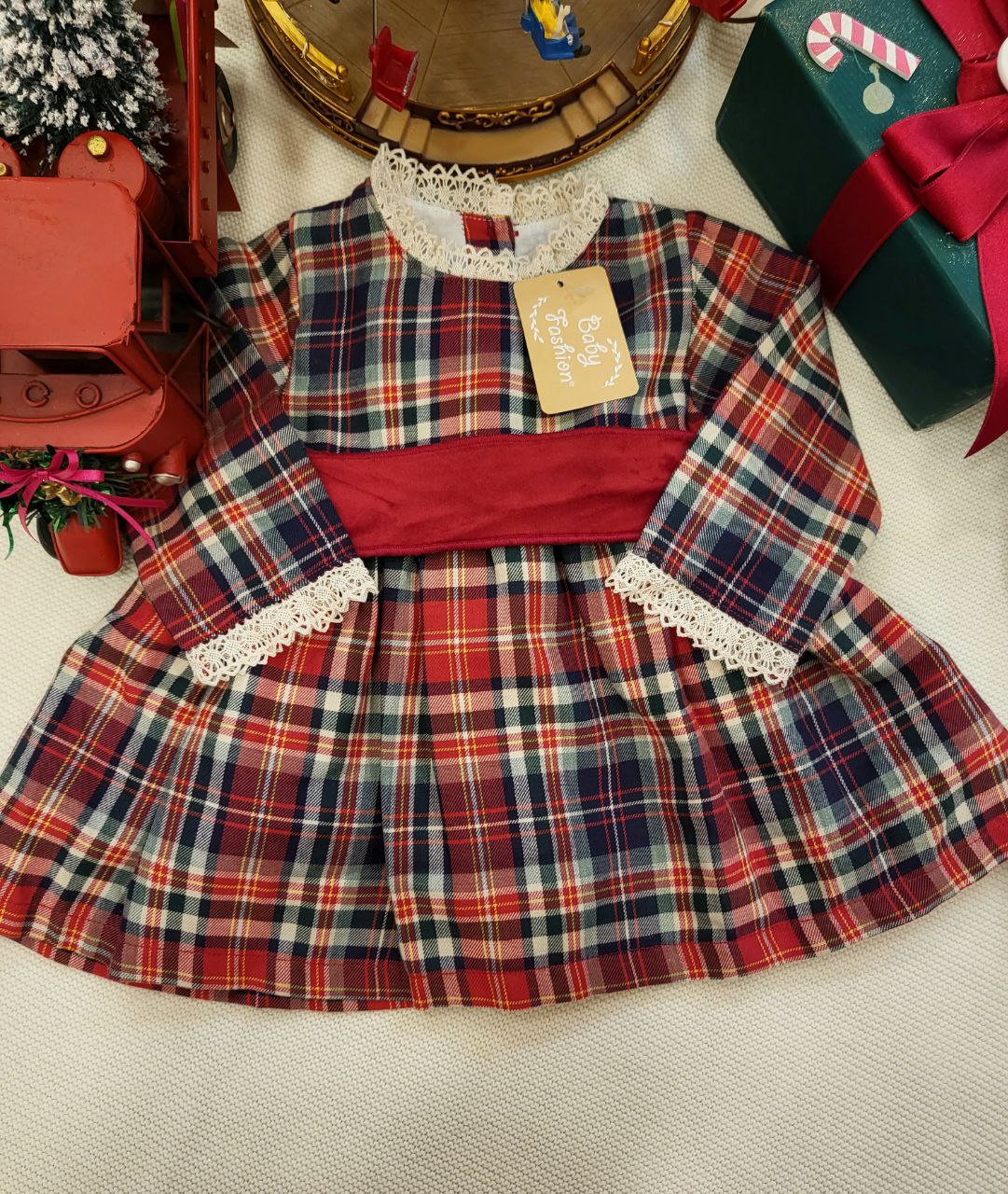 ABITO BABY FASHION IN TARTAN CON FASCIA IN VITA IN VELLUTO ROSSA E COLLETTO IN PIZZO