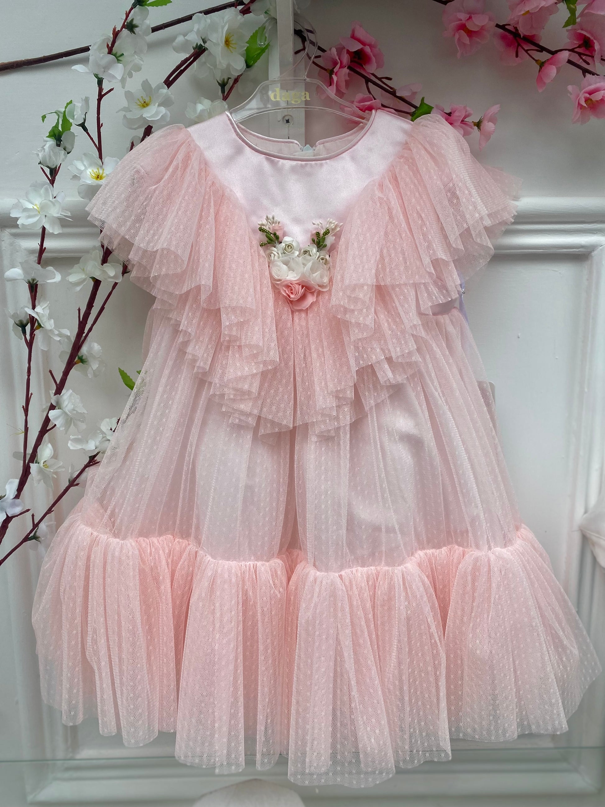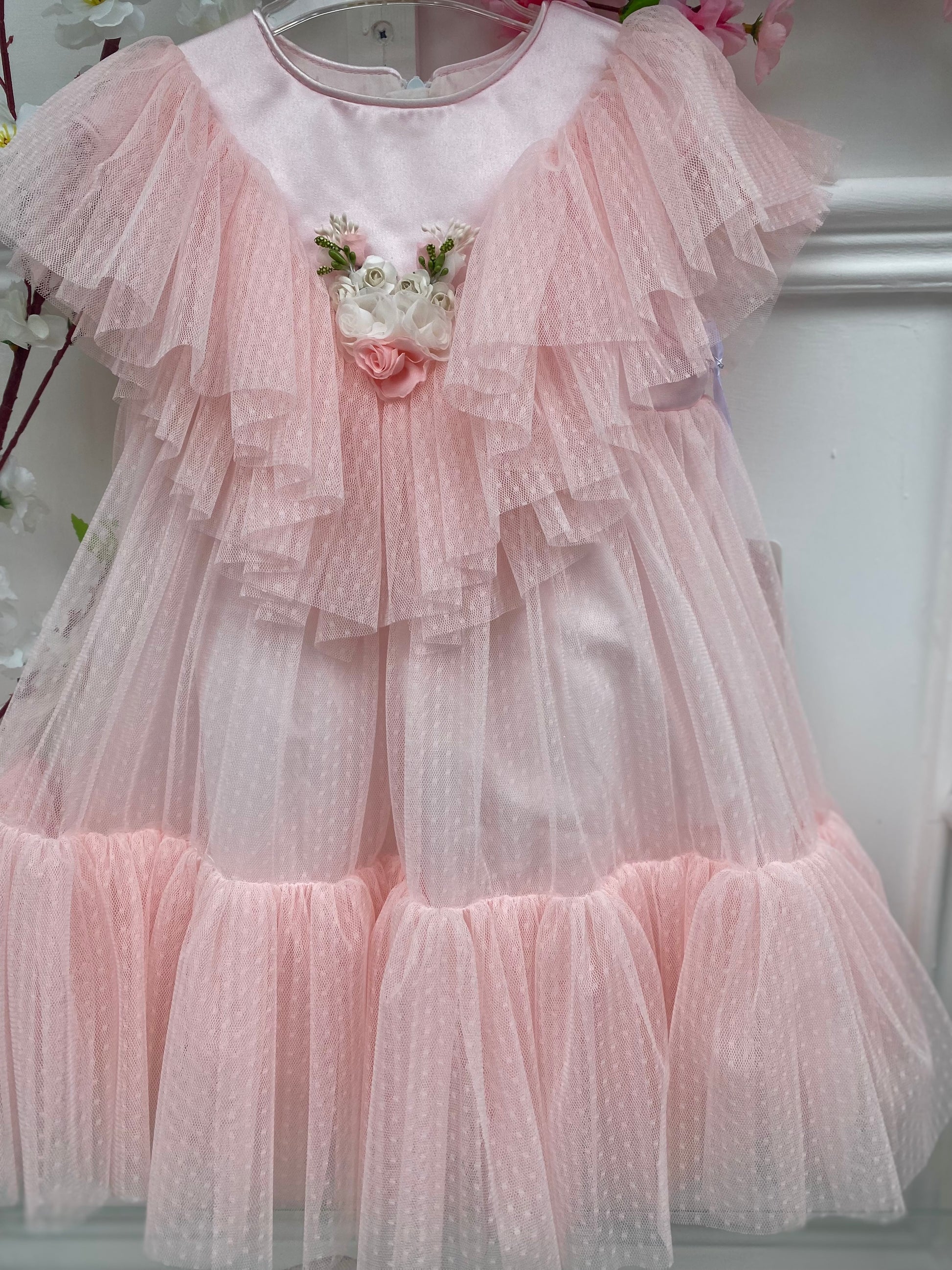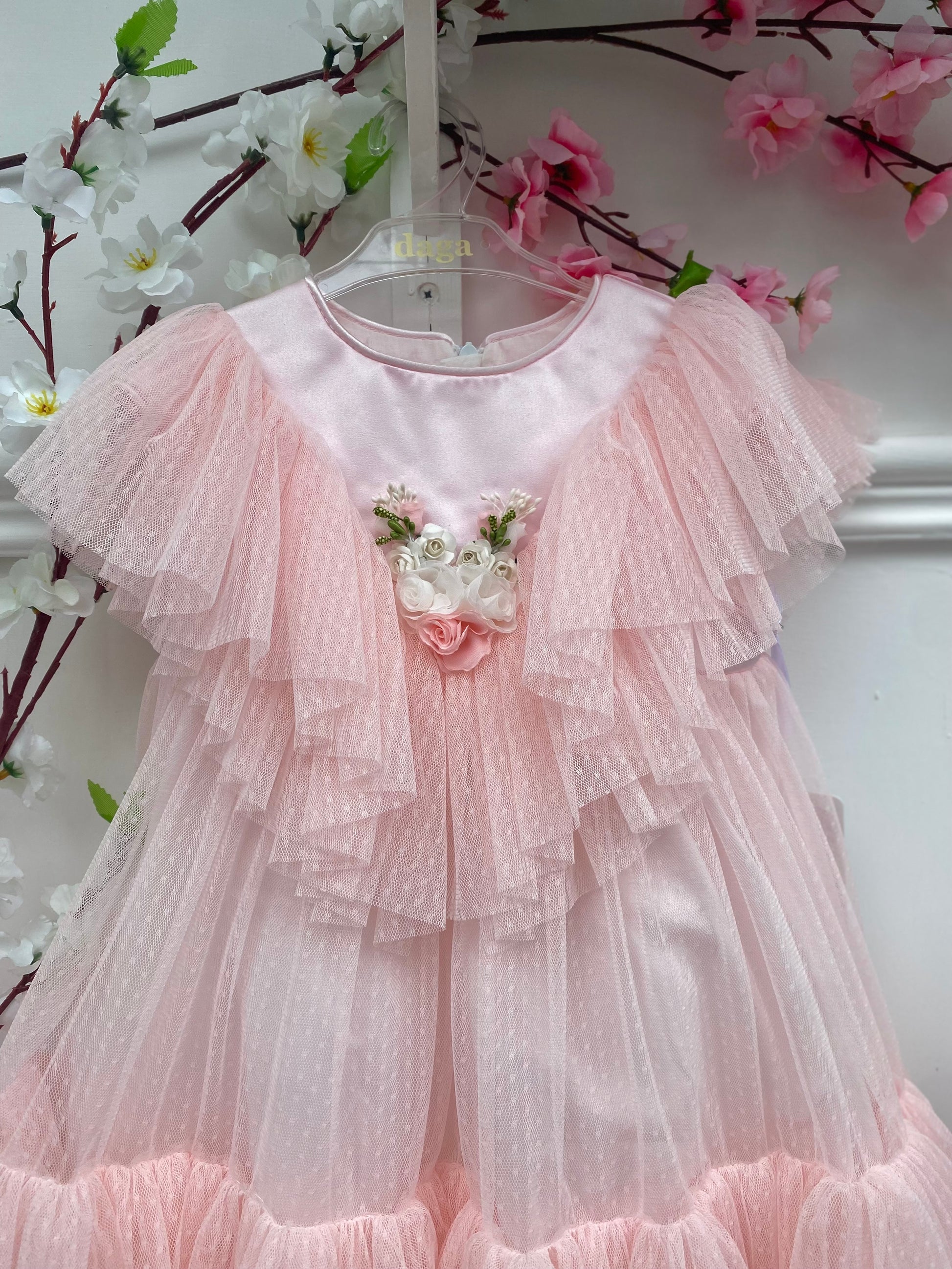Splendido abito daga in rosa con tulle e applicazioni fiori