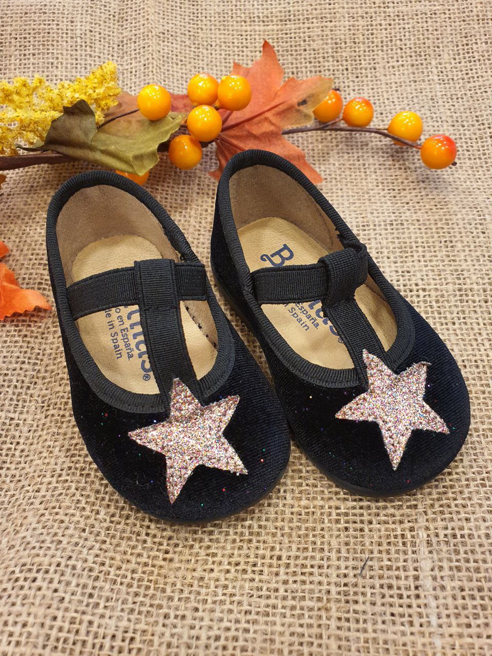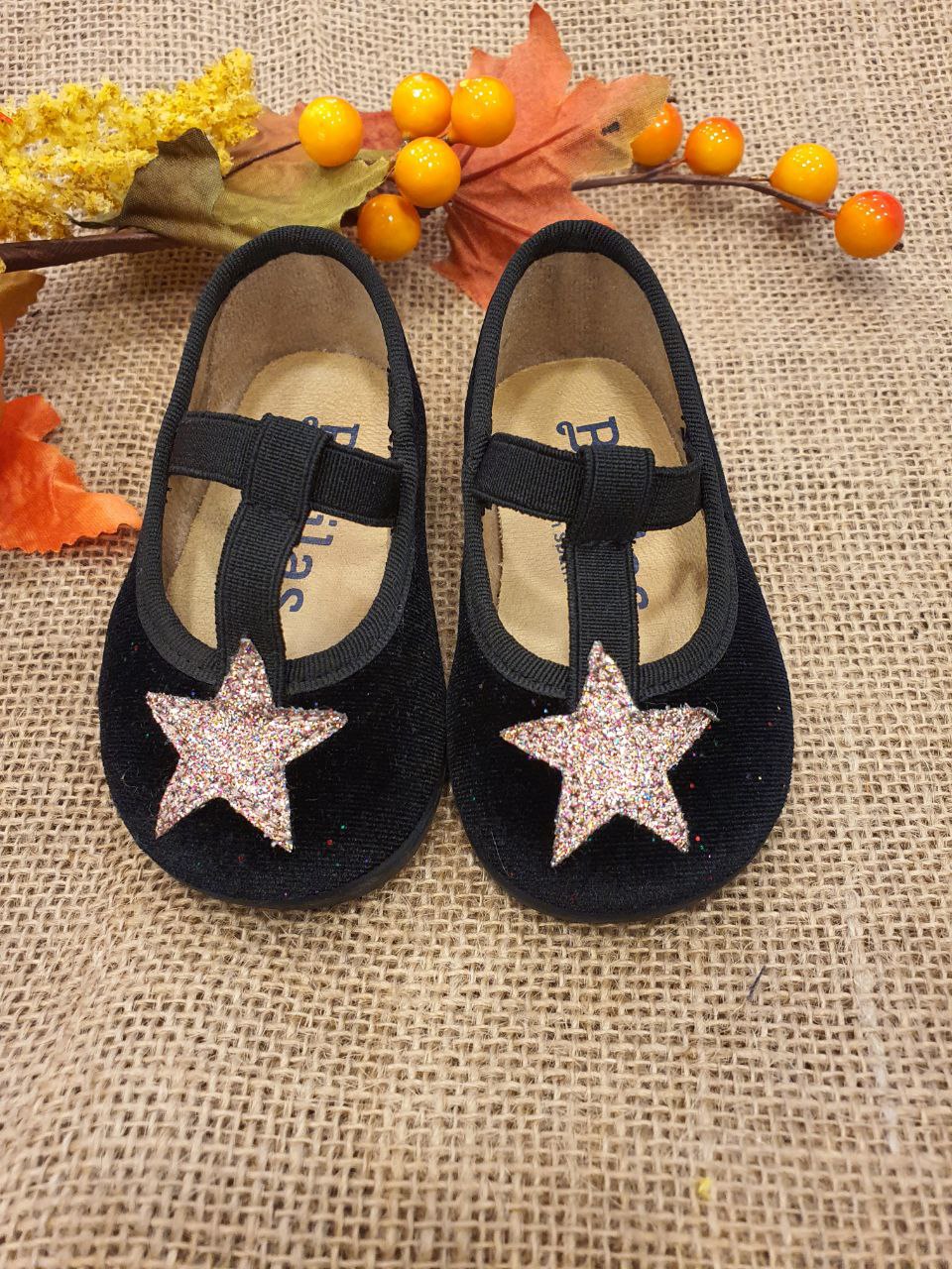 La scarpa Bambolina in velluto nero con stella Batilas unisce eleganza e comfort per i più piccoli. Realizzata con materiali morbidi e rifinita con un dettaglio a forma di stella, offre stile unico e un tocco di brillantezza ad ogni passo. Perfetta per accompagnare i momenti speciali dei bambini con una calzata confortevole e resistente.
