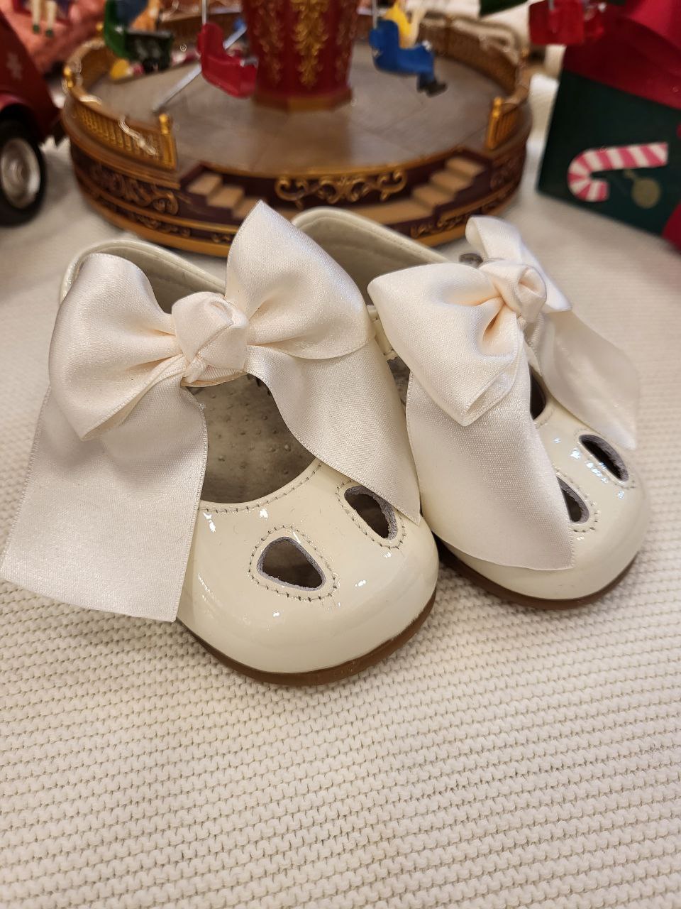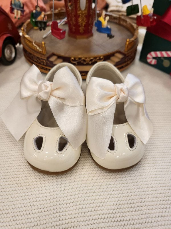 Scarpa bambolina lucida con l'occhiello e fiocco per i tuoi primi passi. Fai risplendere ogni passo con stile e sicurezza. Perfetta per piccoli piedi desiderosi di esplorare il mondo.