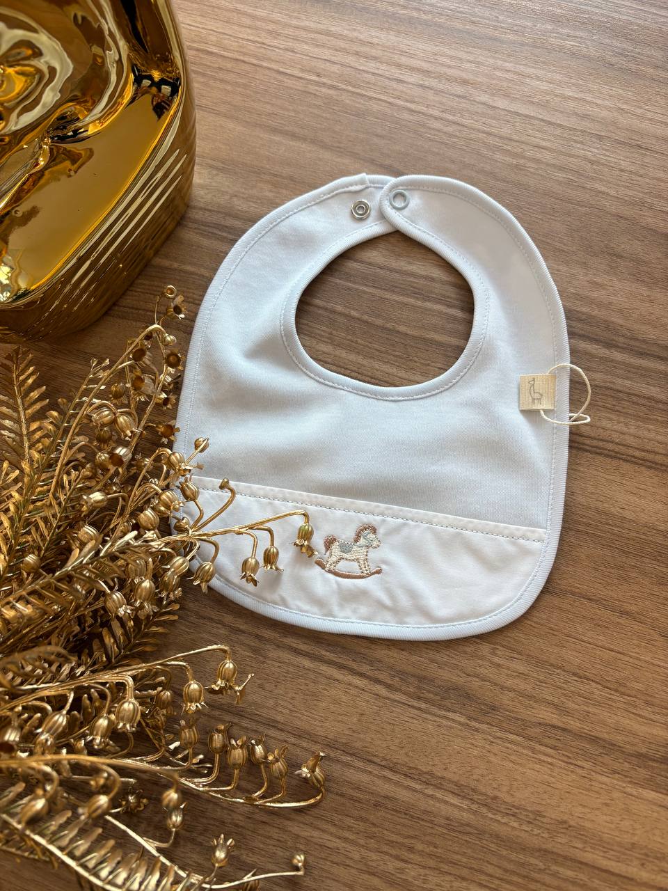 Bavaglino in cotone morbido con adorabile stampa di cavallo a dondolo in tonalità celeste. Perfetto per i neonati, questo bavaglino combina praticità e dolcezza: protegge gli abiti dai piccoli disordini durante i pasti e le attività quotidiane, mentre il design delicato lo rende un accessorio affascinante. La chiusura regolabile si adatta comodamente al collo del bambino, garantendo comfort e sicurezza. Un must-have per ogni guardaroba neonatale, ideale anche come regalo speciale per i neo-genitori.