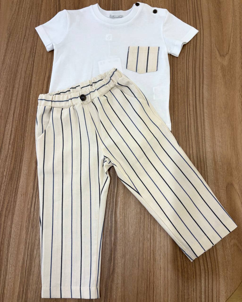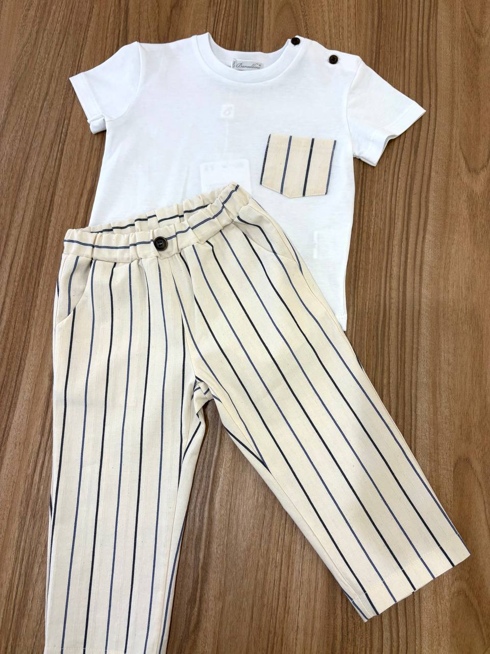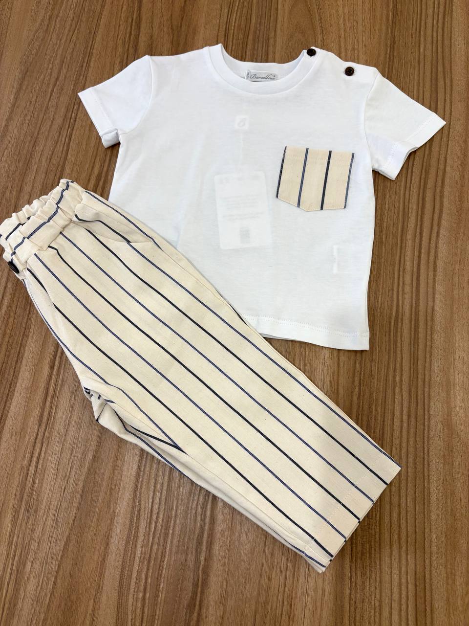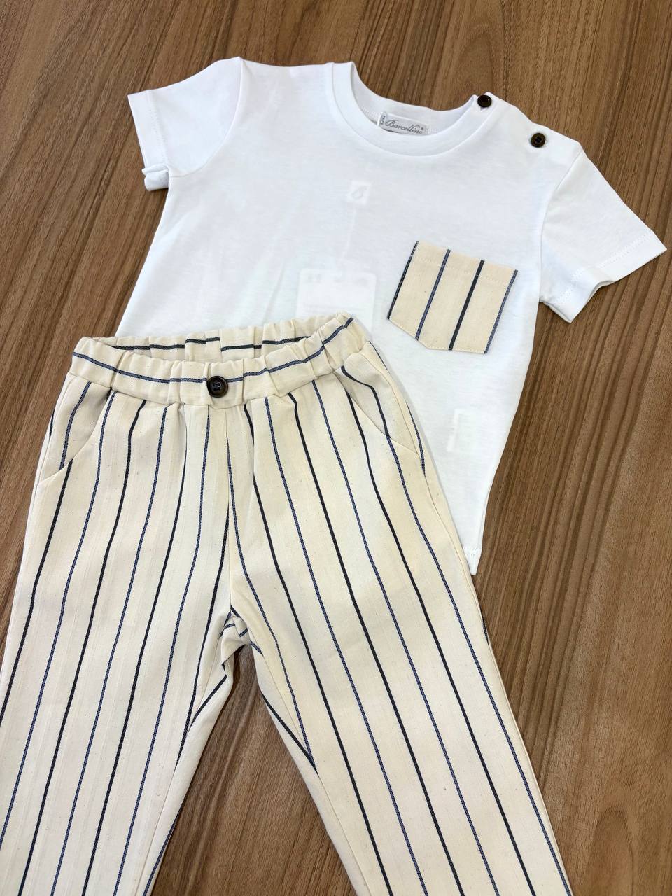 Il Completo A Righe Barcellino è una combinazione di t-shirt e pantaloni per bambini, progettato per offrire comfort e stile. Realizzato con materiali di alta qualità, garantisce una vestibilità ottimale e resistenza all'usura. Adatto per l'uso quotidiano, questo completo è ideale per attività all'aperto e momenti di svago.