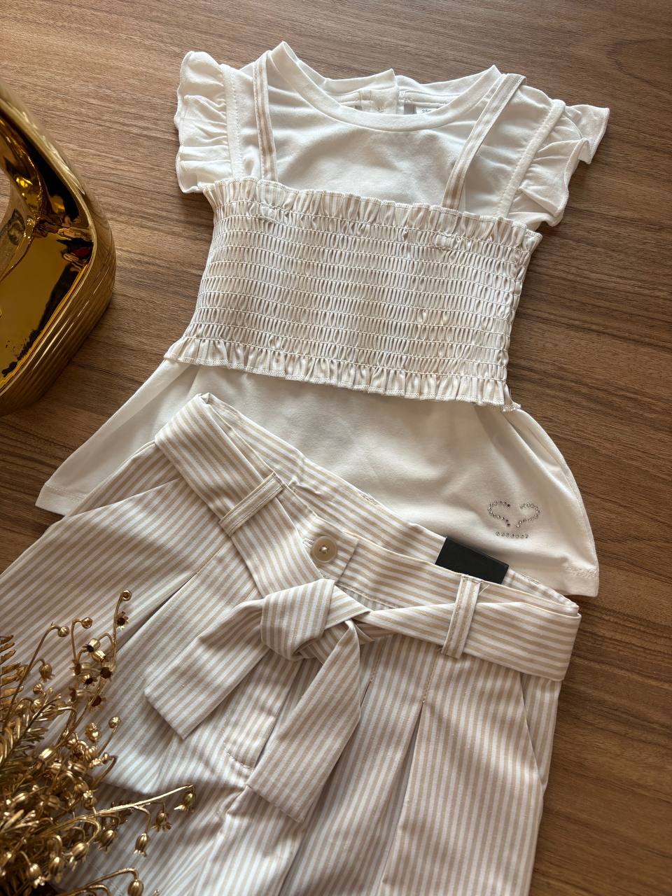 Completo a righe beige Sarabanda per bambina: shorts, t-shirt e top coordinati in un'unica soluzione. Perfetto per la primavera e l'estate, questo set offre praticità e stile con il suo design a righe delicate. Realizzato con attenzione ai dettagli, il completo garantisce comfort durante il gioco e le attività quotidiane. Un'opzione versatile che semplifica la scelta dell'outfit e assicura un look coordinato e curato in ogni occasione.