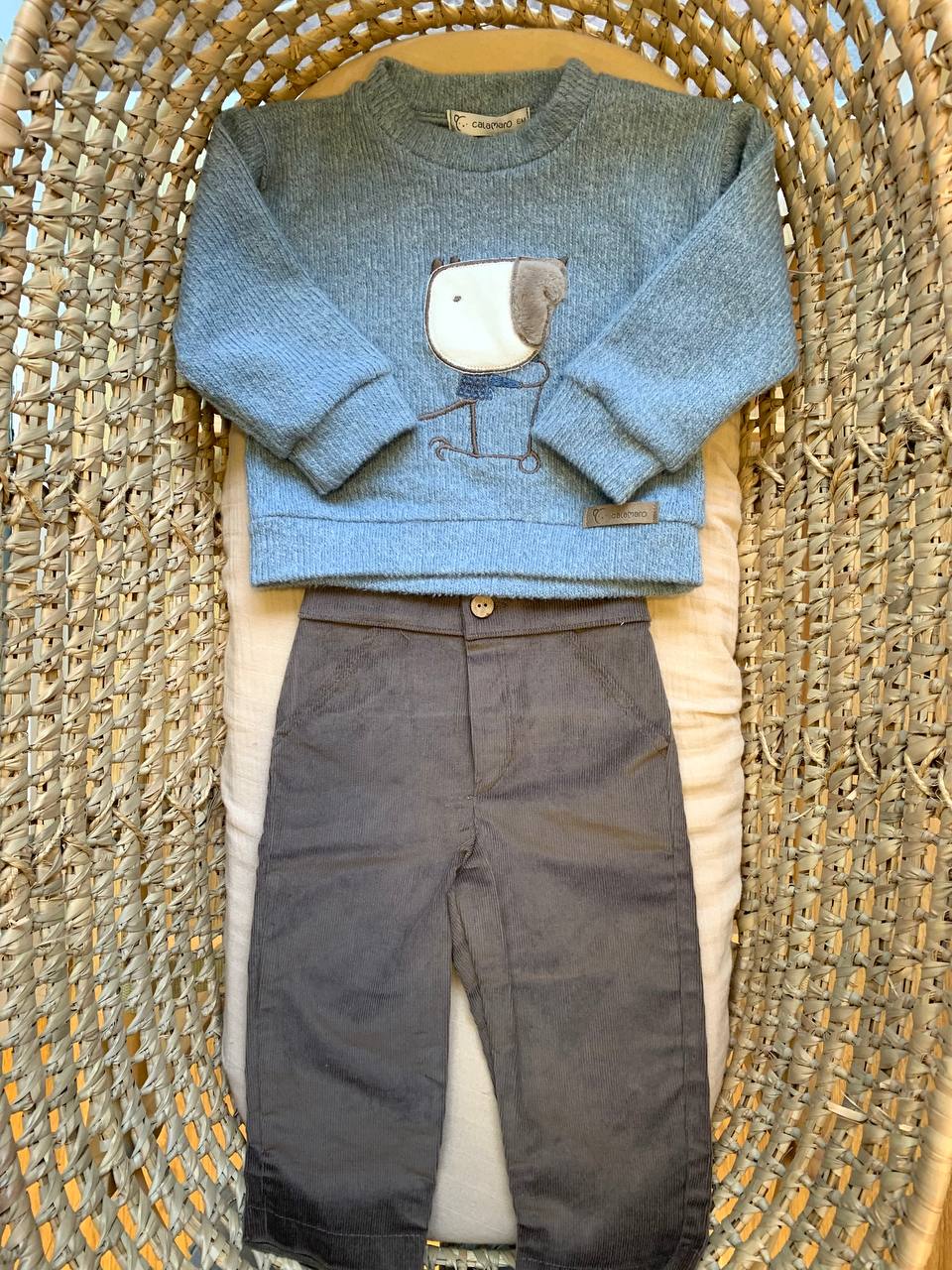 Per i piccoli alla moda, ecco il Completo Calamaro composto da maglioncino e pantalone. Realizzato con cura e materiali di alta qualità , questo abito è perfetto per tenere al caldo il tuo neonato con stile. Una scelta sicura per affrontare le giornate più fresche con eleganza.
