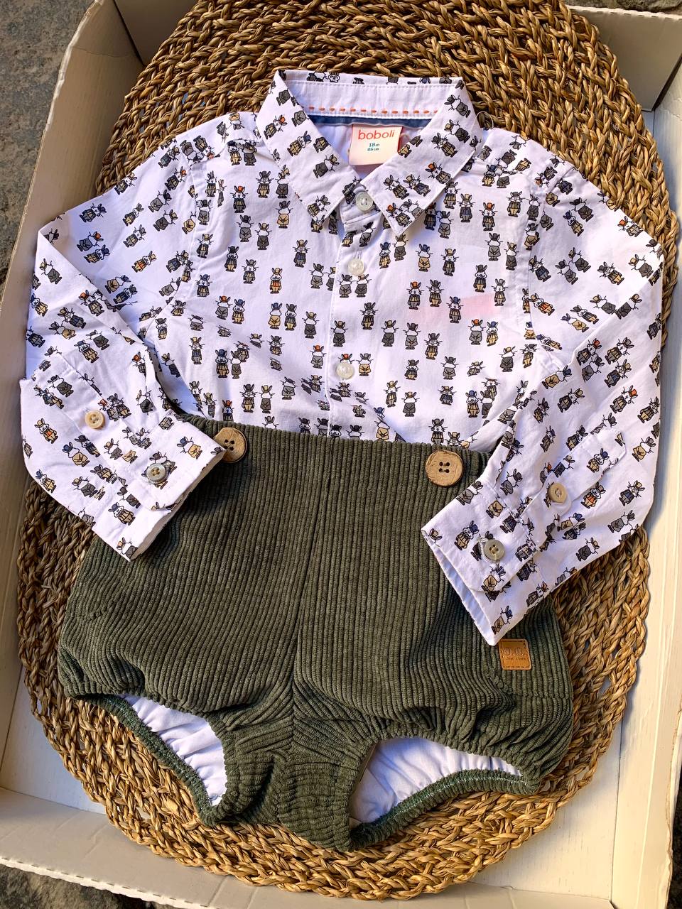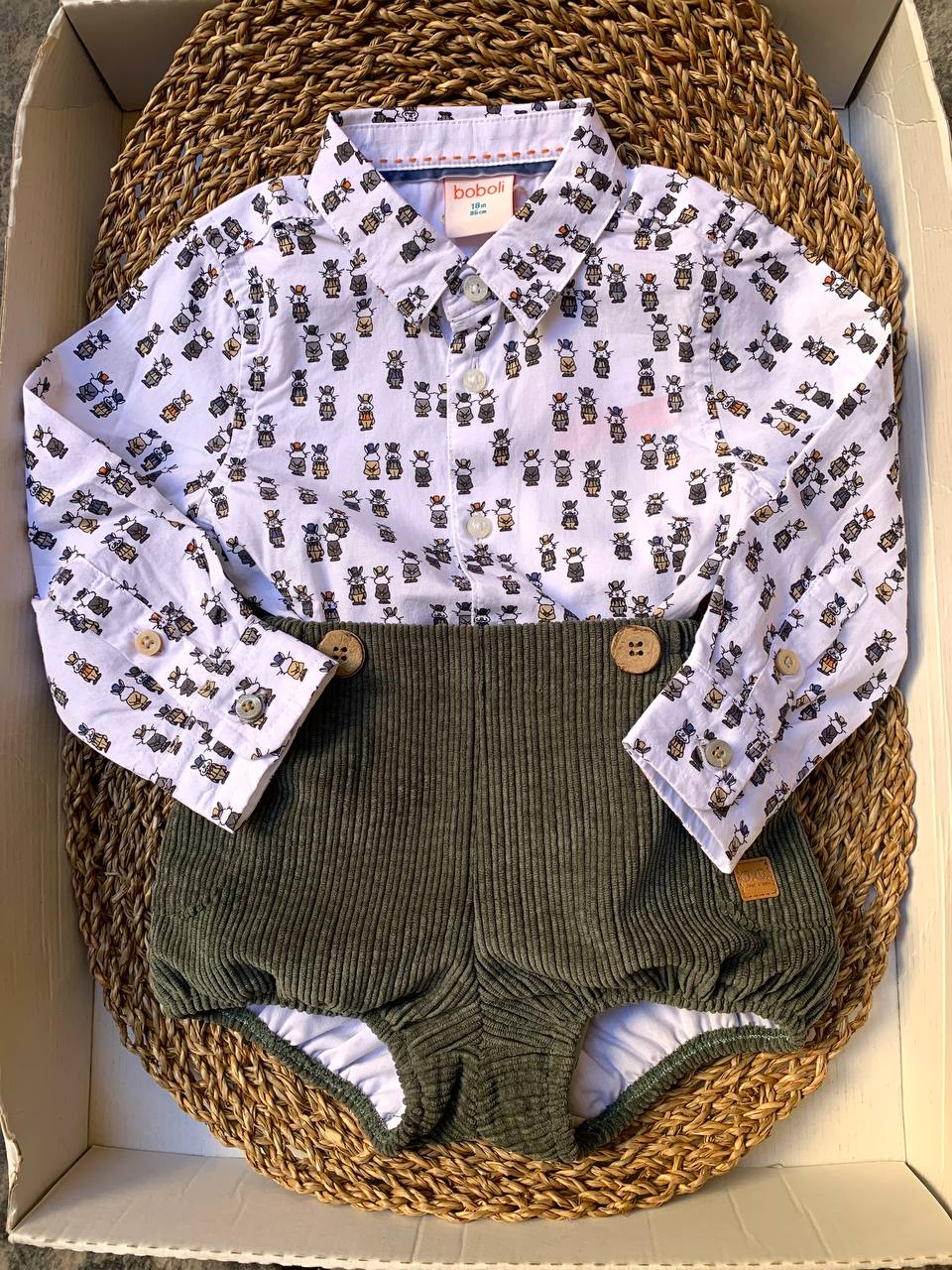 Questo completo coniglietti è perfetto per il tuo piccolo bebè. Include una morbida camicia con un tenero motivo coniglietti e una culotte in velluto verde. Ideale per tenere il tuo piccolo al caldo e allo stesso tempo alla moda. Confortevole e adorabile, perfetto per ogni occasione.