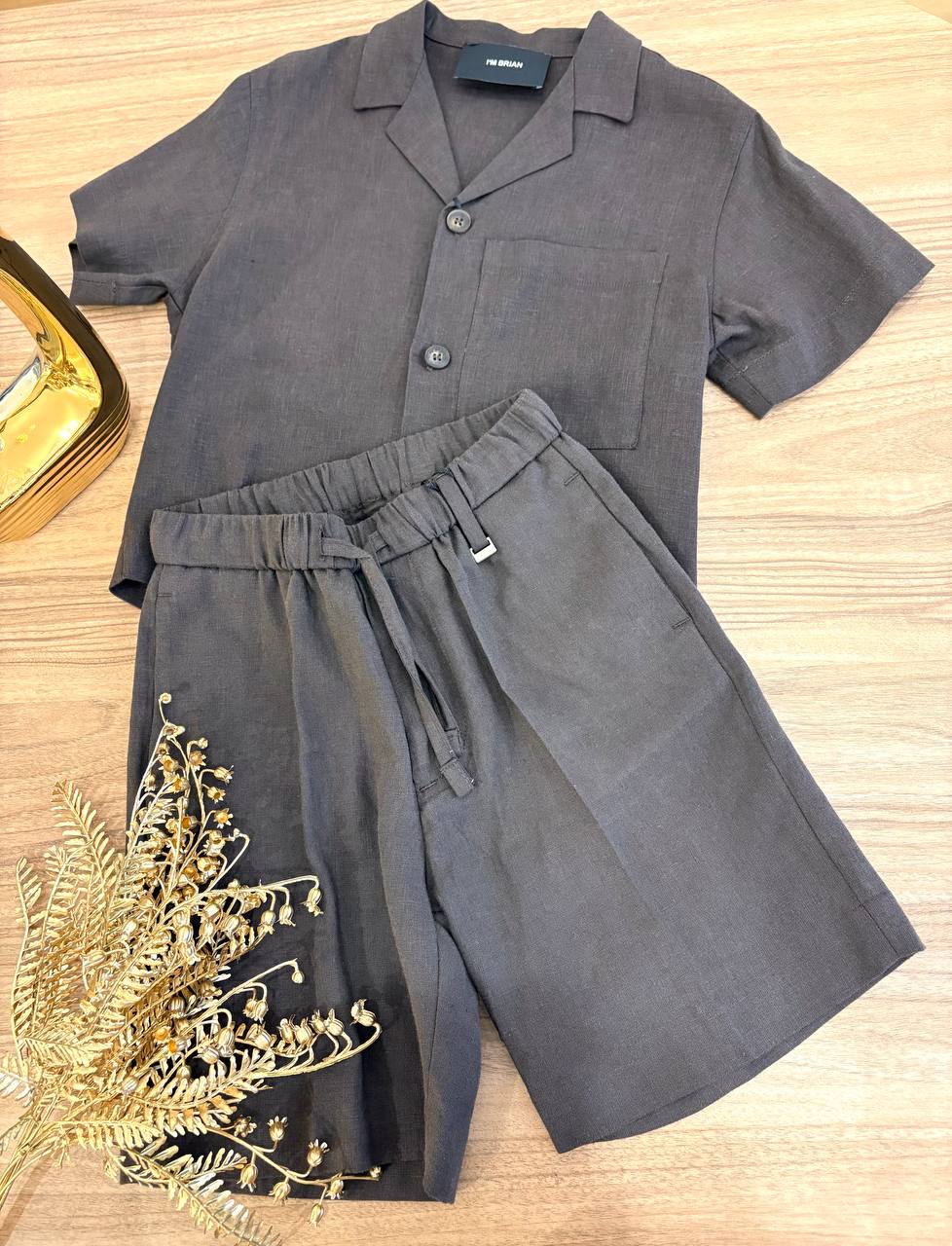 Il Completo IN LINO MARRONE I'M BRIAN è composto da un elegante bermuda e una camicia coordinata, realizzati in lino. Questo materiale traspirante offre un comfort ottimale per i bambini, con una maggiore regolazione della temperatura corporea. Ideale per occasioni estive, la sua tonalità marrone si abbina facilmente ad altri capi.