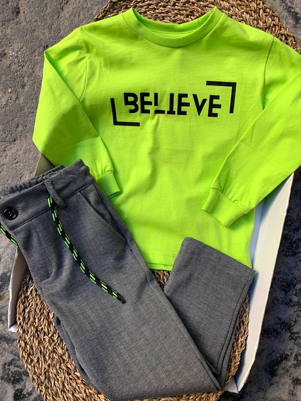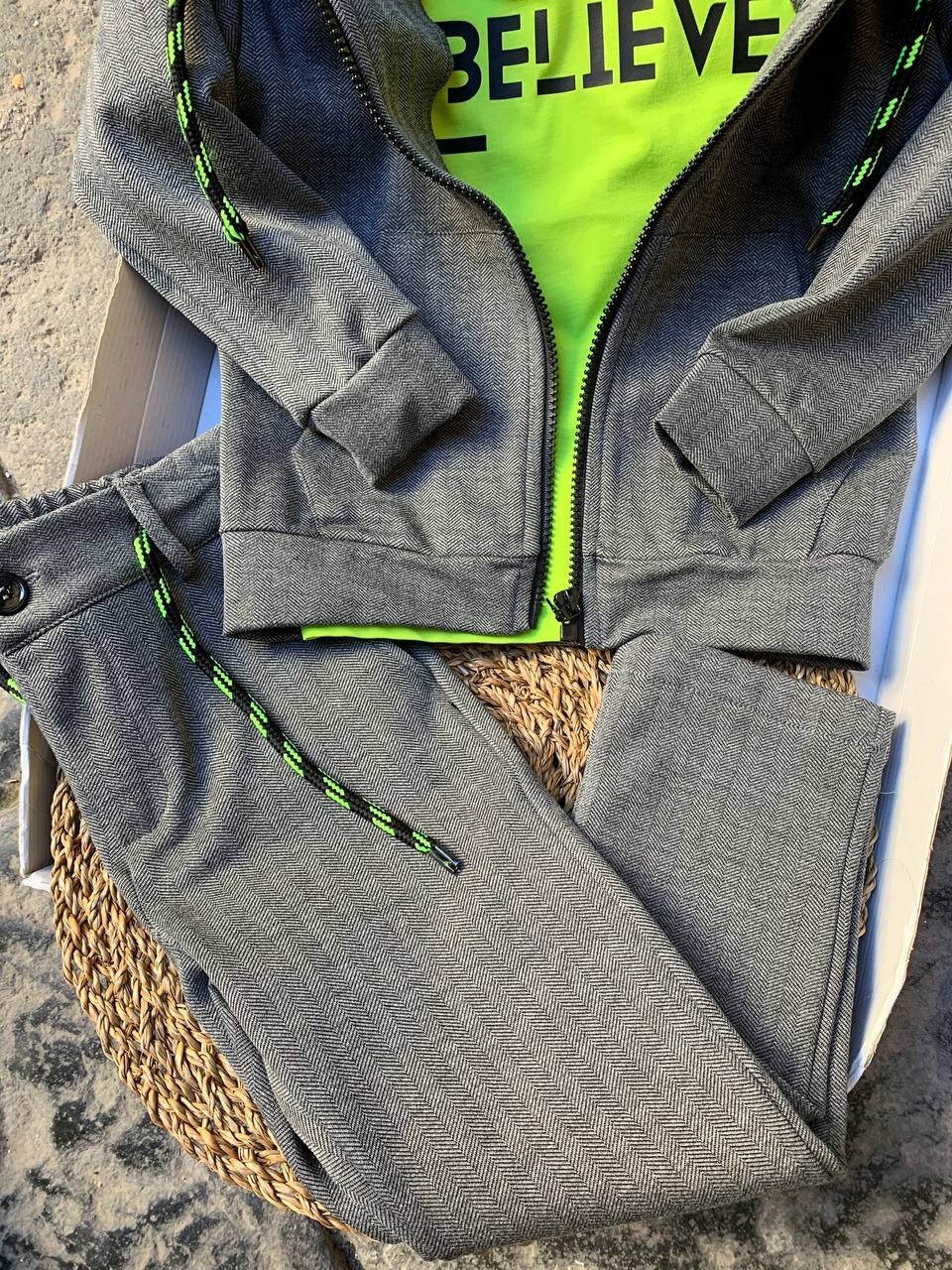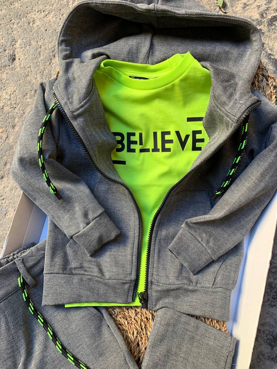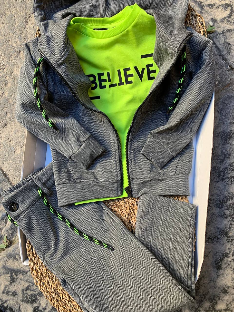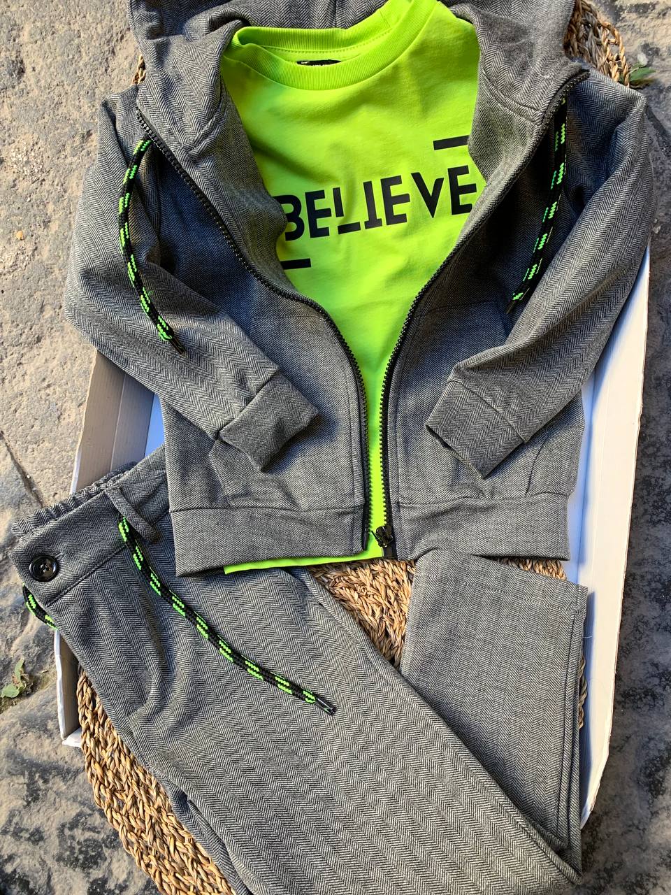 Il Completo LIME NEVER TOO è composto da una felpa, una tuta e una t-shirt . La t-shirt presenta un colore lime ,mentre la felpa e la tuta offrono comodità e stile grazie al loro design moderno. Con questo completo il tuo bambino esempre alla moda e confortevole in ogni occasione.
