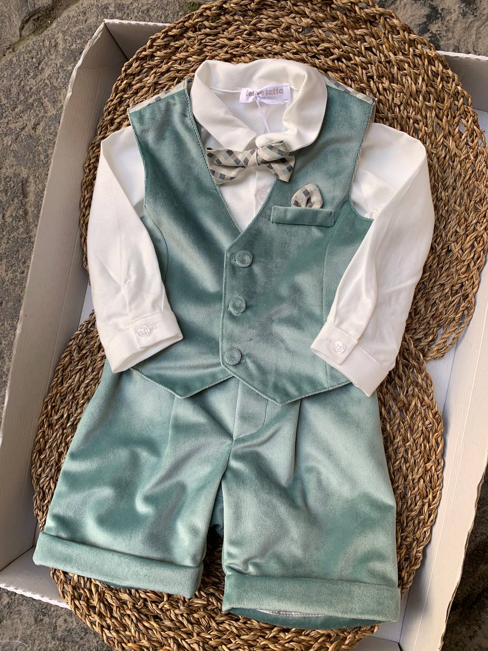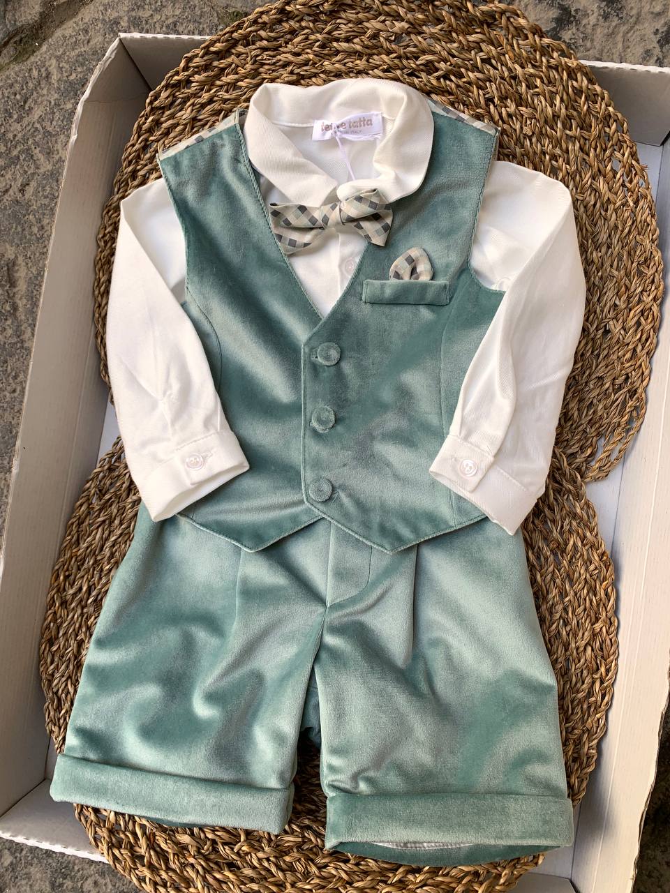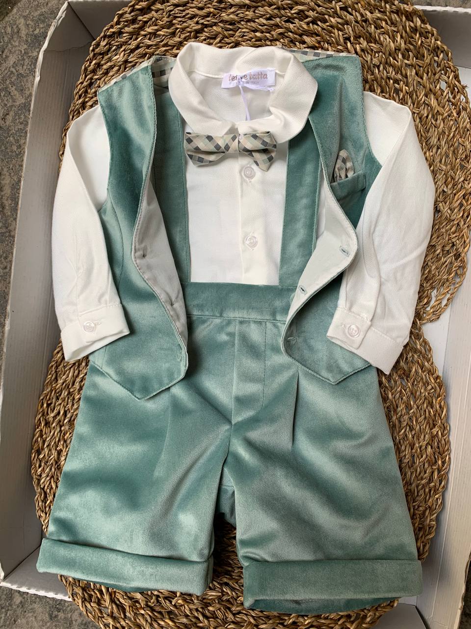 Completo per neonato in color petrolio adatto per cerimonie. Include salopette, gilet e papillon coordinato. Prodotto di alta qualità per un look elegante e originale. Ideale per le occasioni speciali del tuo bambino. Realizzato con materiali morbidi e confortevoli per il massimo comfort del tuo piccolo.