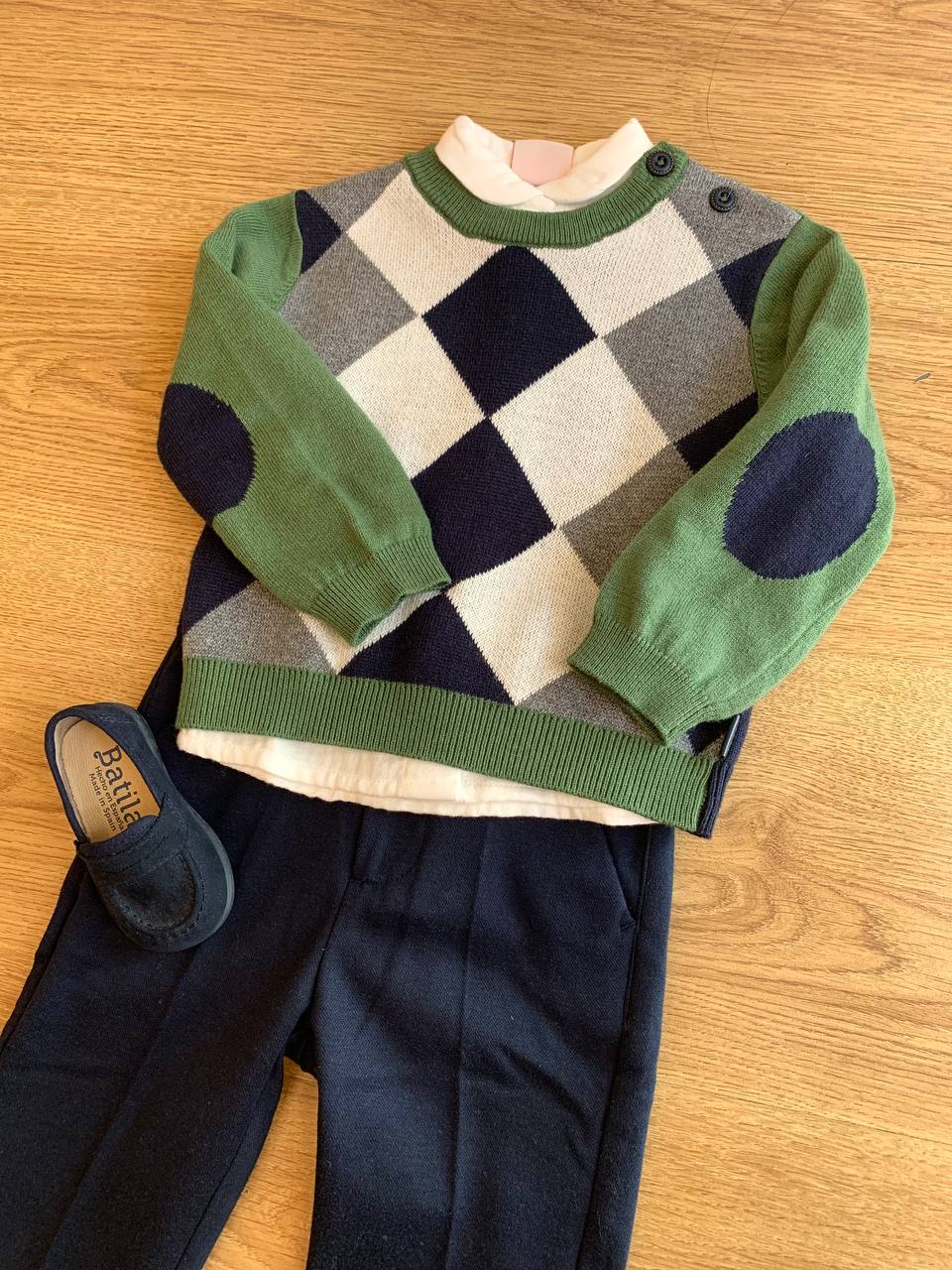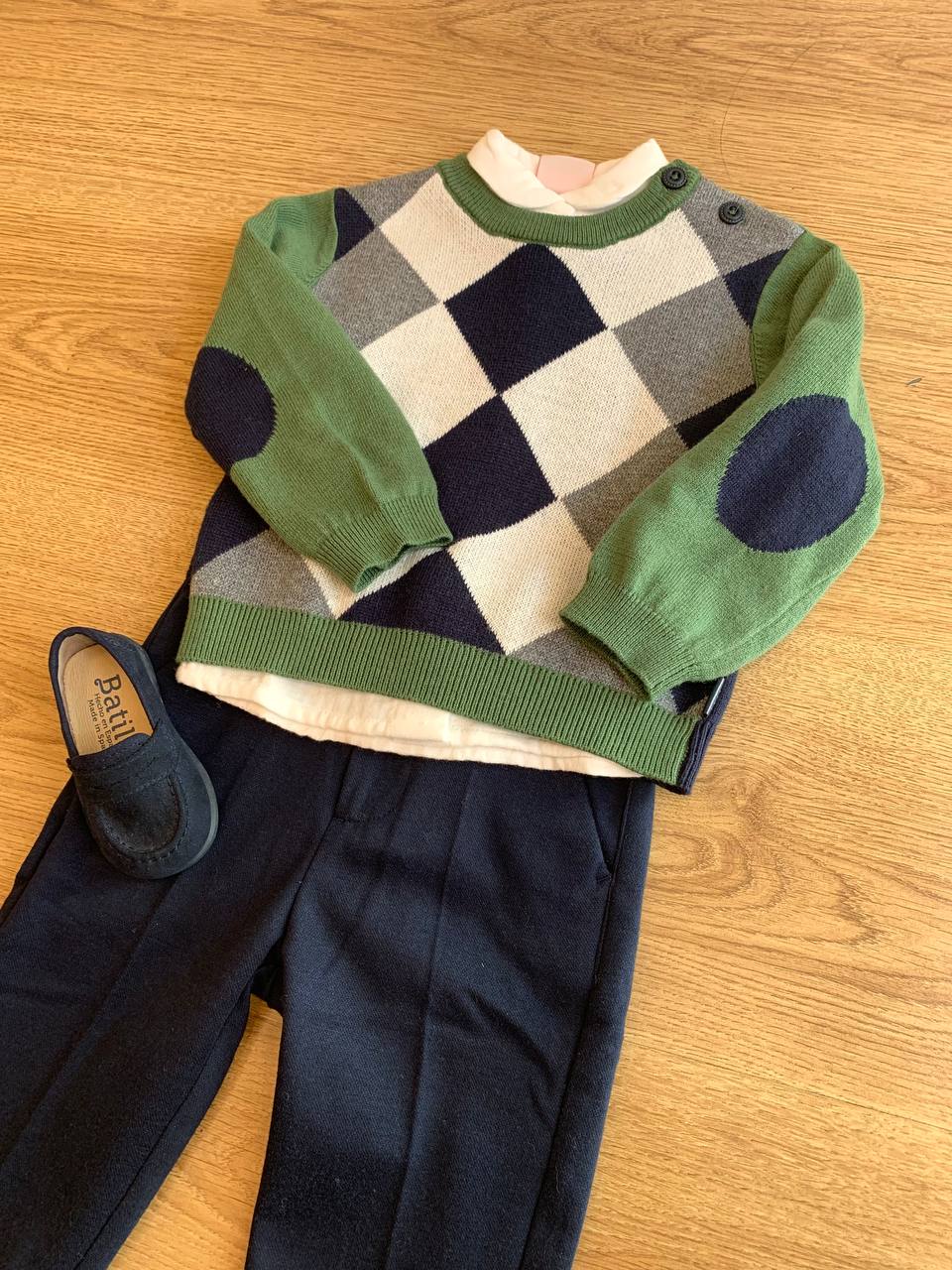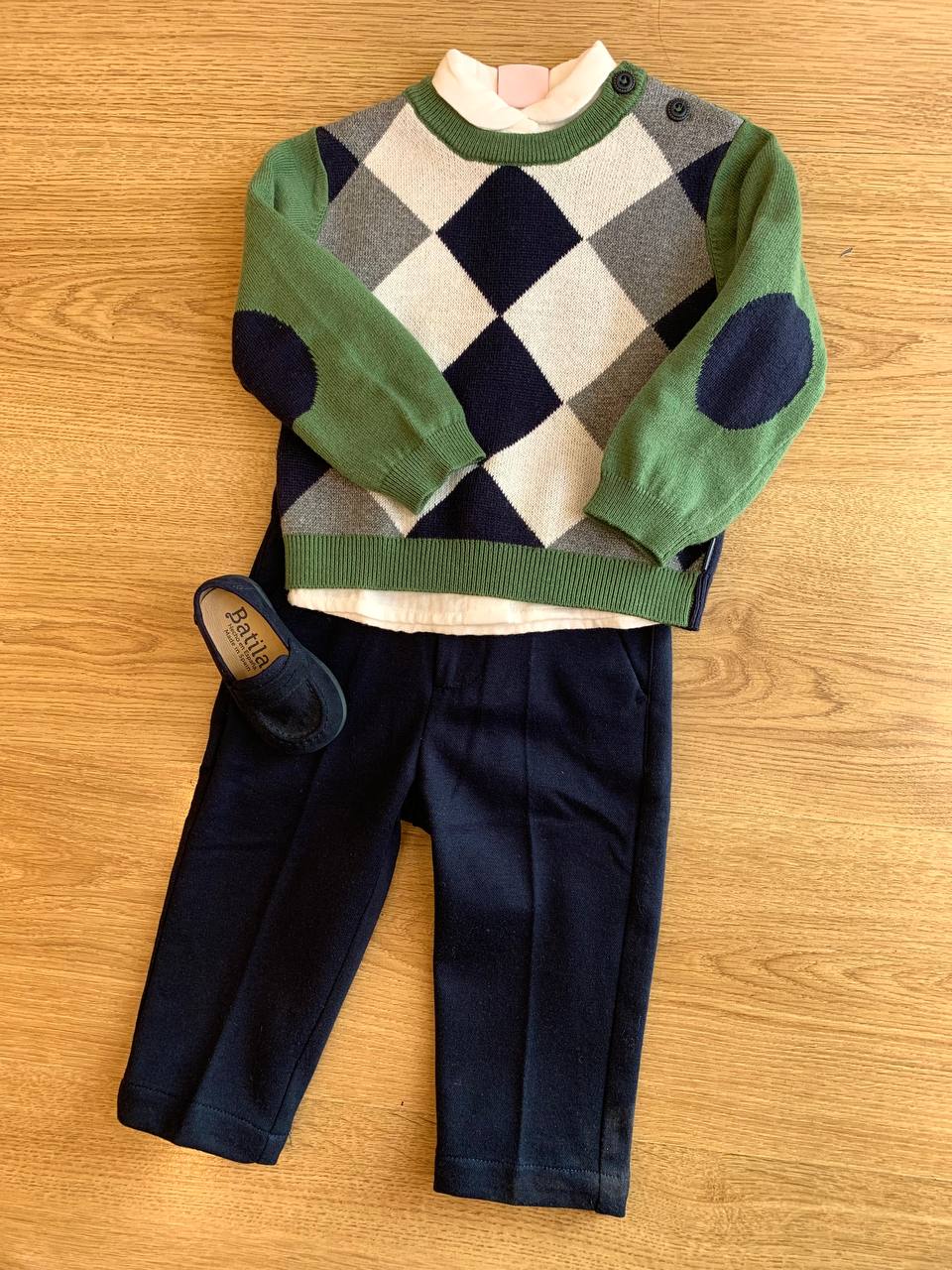 Questo completo tre pezzi della marca Boboli è perfetto per il tuo bambino. Il maglioncino con fantasia a rombi è morbido e caldo, ideale per proteggerlo dal freddo durante i mesi più freddi. La camicia e il pantalone aggiungono un tocco di eleganza e comodità per ogni occasione.