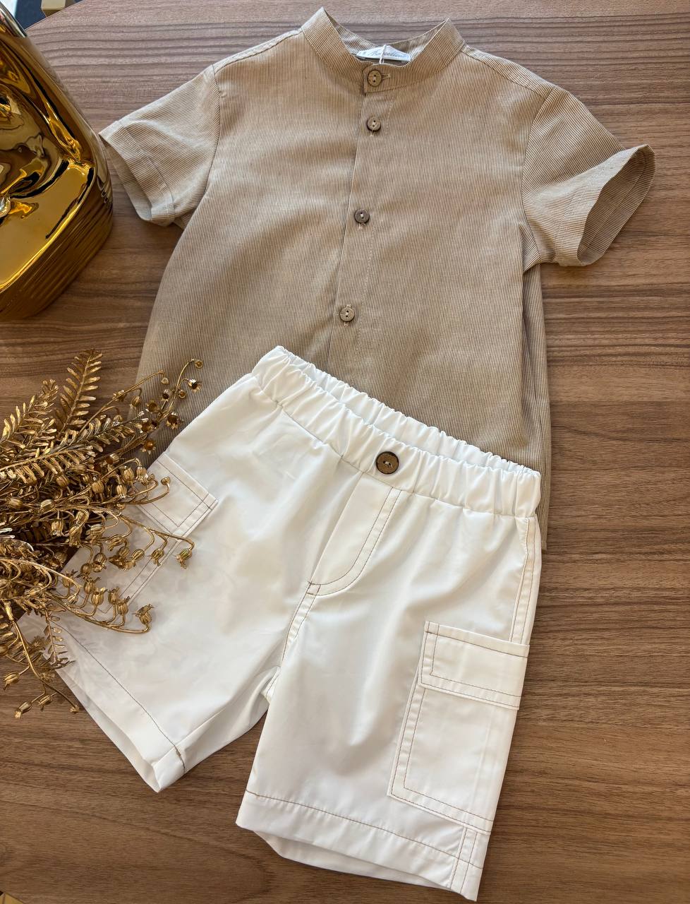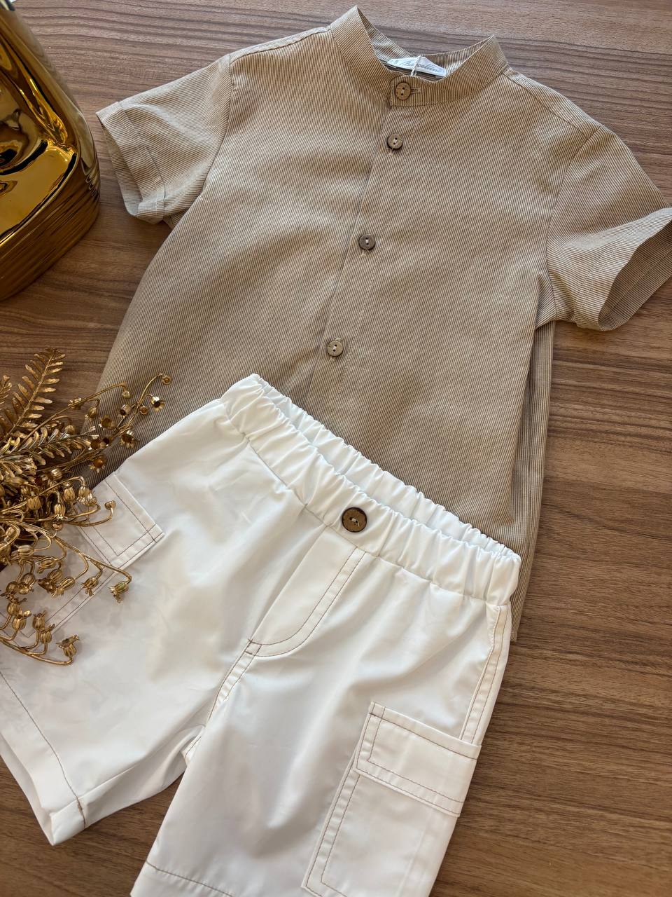 Completo estivo per bambino, realizzato interamente in Italia. Questo set coordinato combina tonalità eleganti di tortora e bianco in un design barcellino che cattura lo stile mediterraneo. Perfetto per le giornate calde, il tessuto traspirante garantisce comfort e libertà di movimento. Ideale per occasioni casual e momenti di gioco, questo completo unisce qualità artigianale e praticità per il guardaroba estivo del tuo bambino.