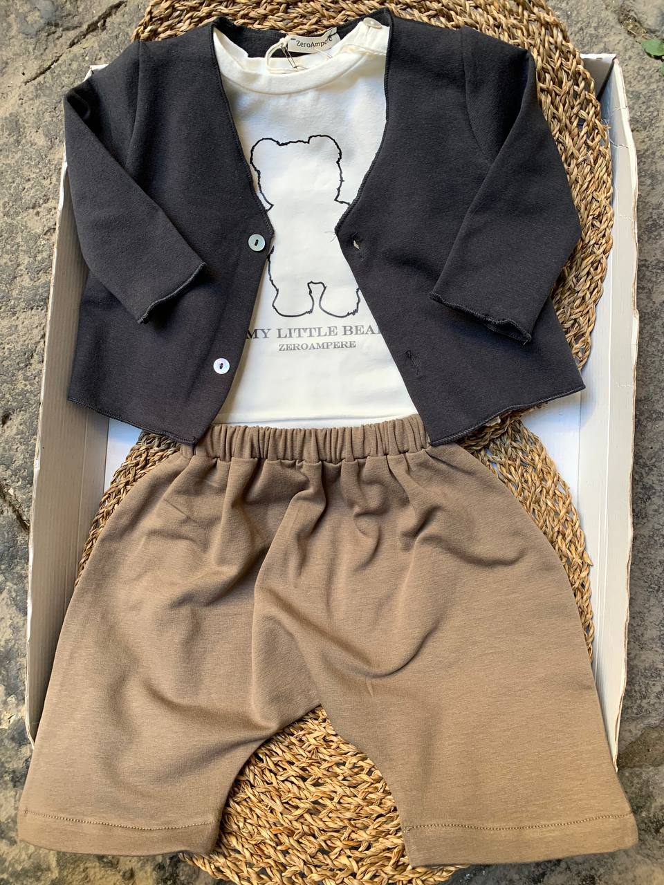 Il Completo tre pezzi WILDE ZEROAMPERE è l'ideale per vestire il tuo neonato con stile e comfort. Composto da cardigan, t-shirt e pantalone, questo completo offre il massimo della praticità e della versatilità . Realizzato con materiali di alta qualità , garantirà al tuo bambino il massimo del comfort e della vestibilità .