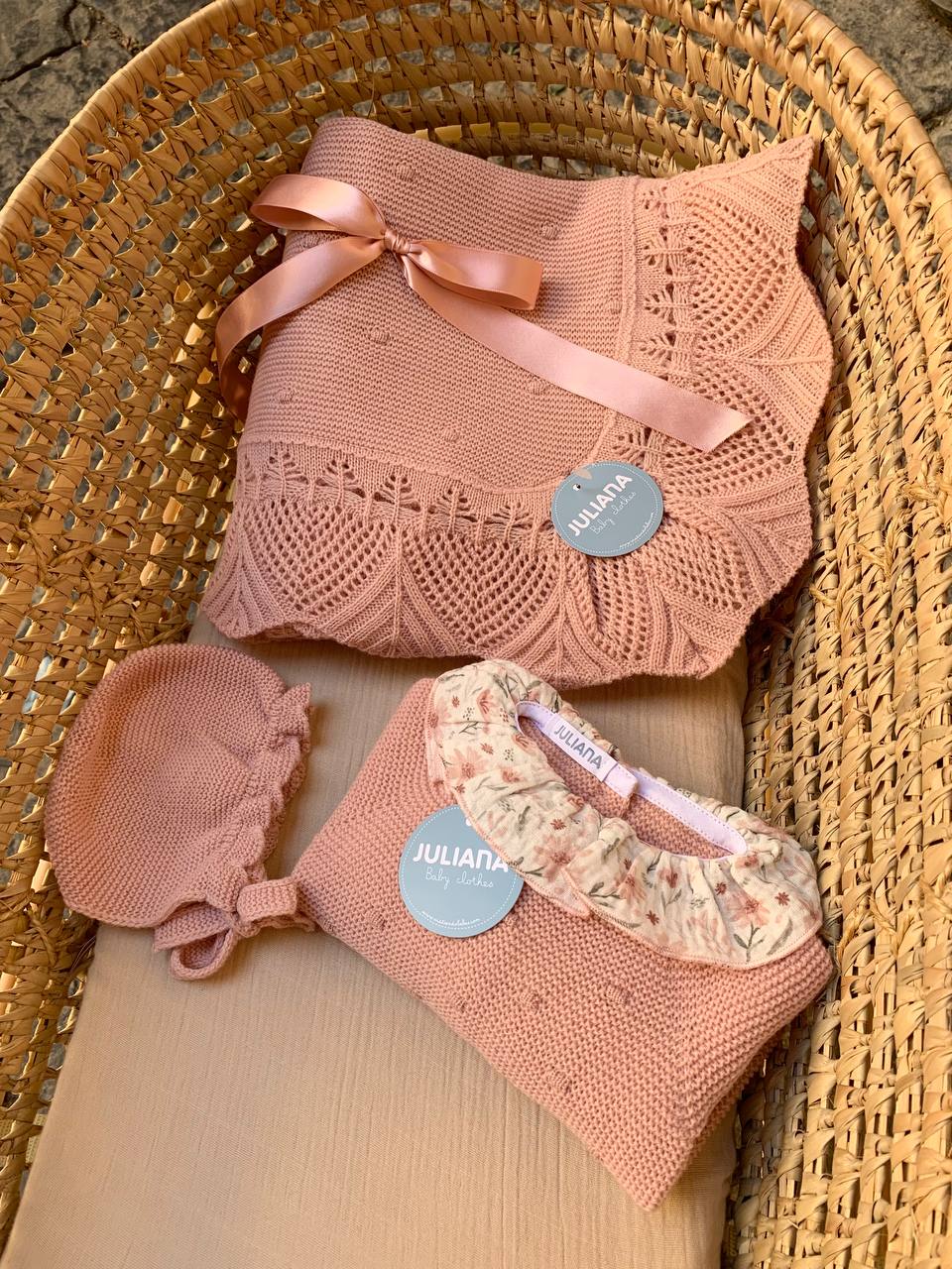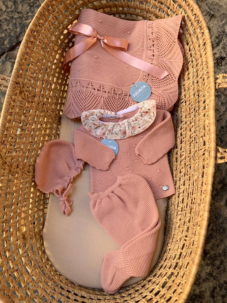 Il coordinato "Arte" Juliana è perfetto per festeggiare l'arrivo di una neonata con stile ed eleganza. Realizzato in lana pregiata, comprende una morbida copertina, una tutina spezzata e un cappellino, tutti decorati con un raffinato motivo artistico. Ideale per mantenere la tua bambina al caldo e al sicuro, mentre si fa ammirare da tutti.