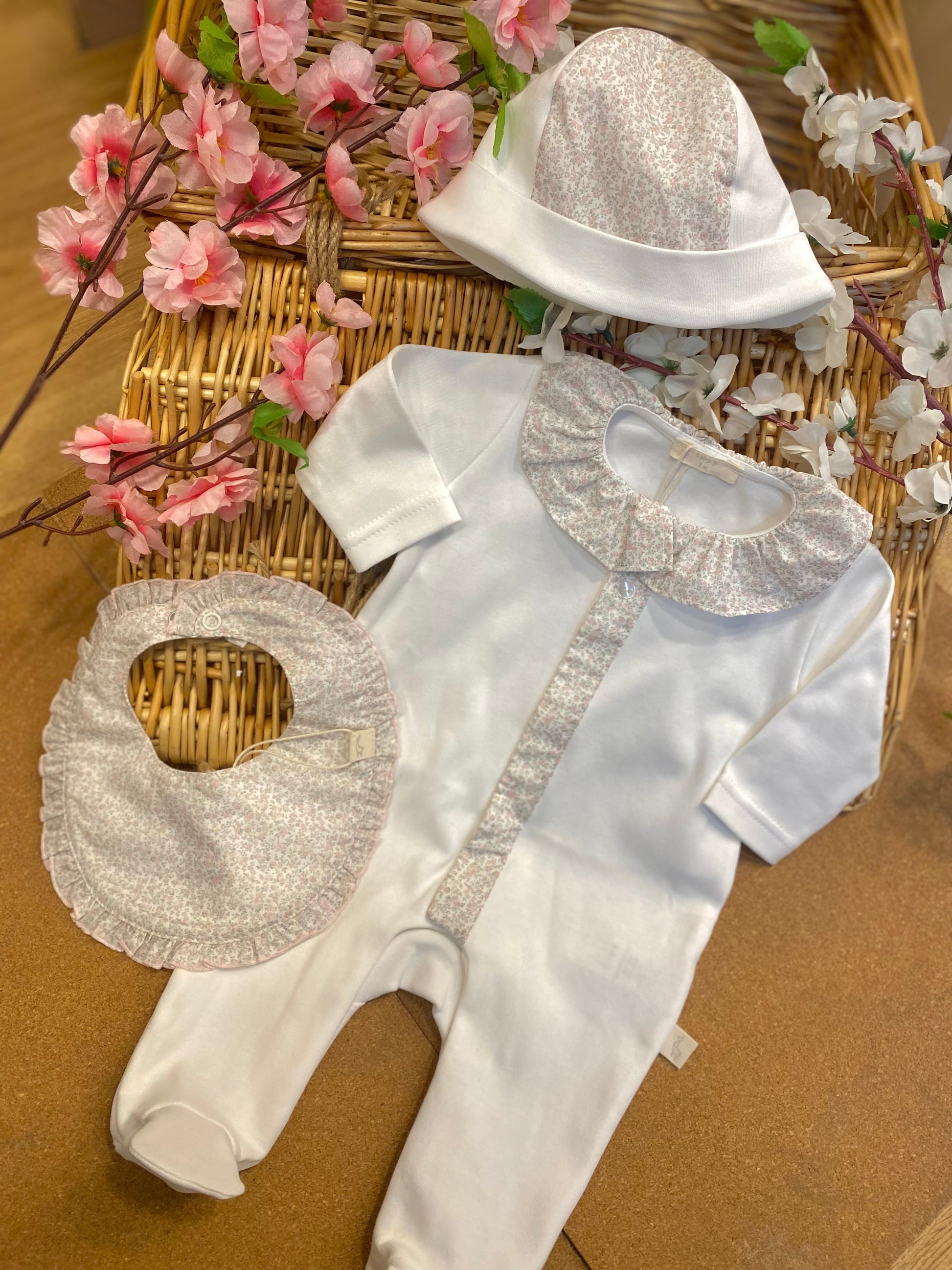 Splendido coordinato con tutina baby gi bianca con colletto in fiori, cappellino e bavaglino abbinati.