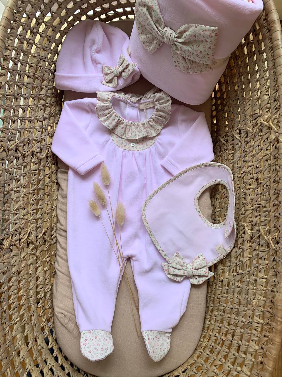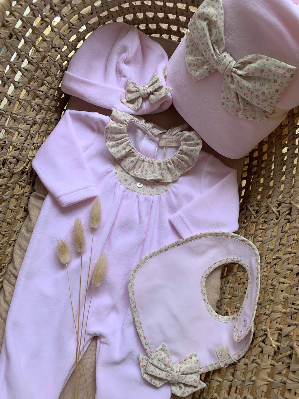 Questo coordinato è l'ideale per la tua bambina appena nata! Include un cappellino, un bavaglino, una tutina e una copertina, tutto coordinato per un outfit perfetto in ogni occasione. Realizzato con materiali di qualità che garantiscono il massimo comfort per il tuo piccolo tesoro.