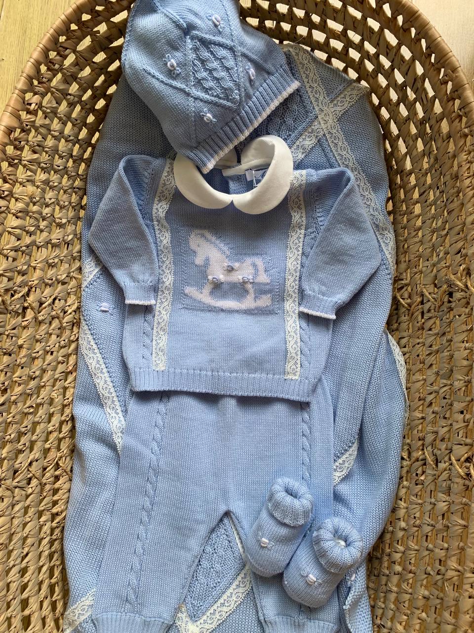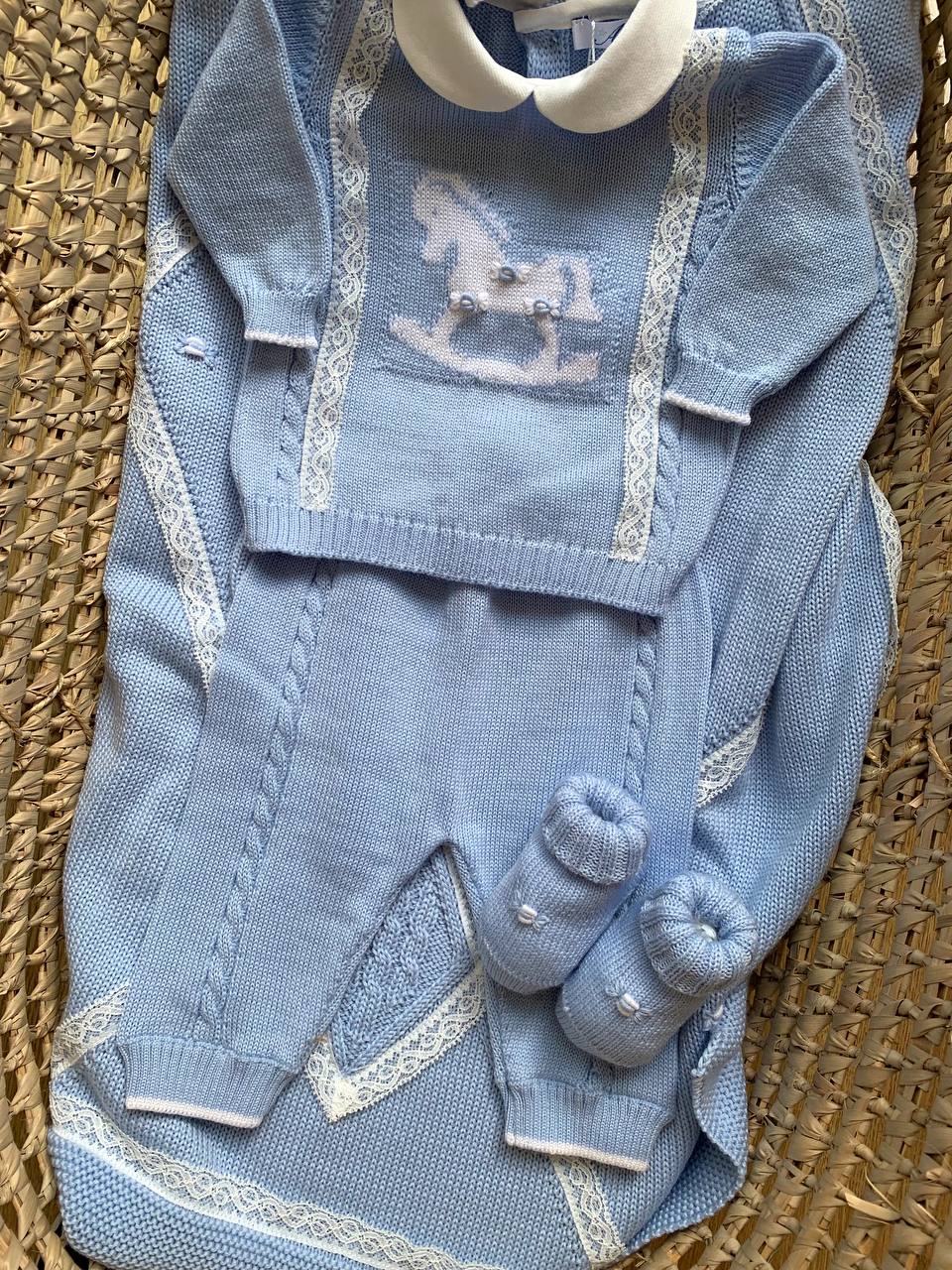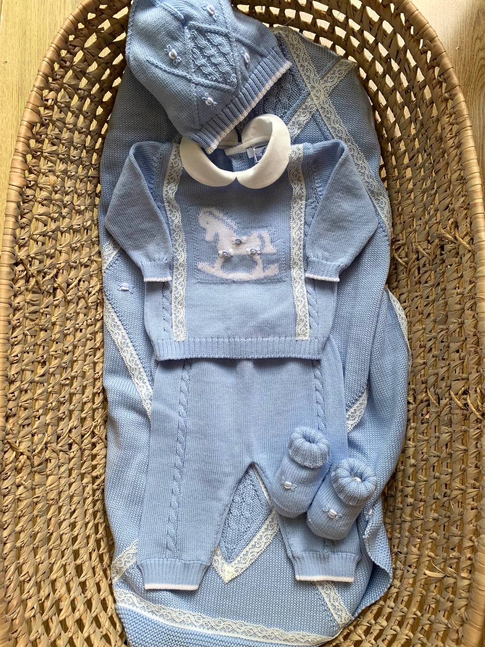 Esalta la dolcezza del tuo neonato con questo coordinato completo di scialle, tutina a due pezzi, cappellino e scarpine. Il cavallo dondolo su ogni capo lo farà sentire coccolato e speciale. Perfetto per regali o per una tenera sessione fotografica. Ordina ora!