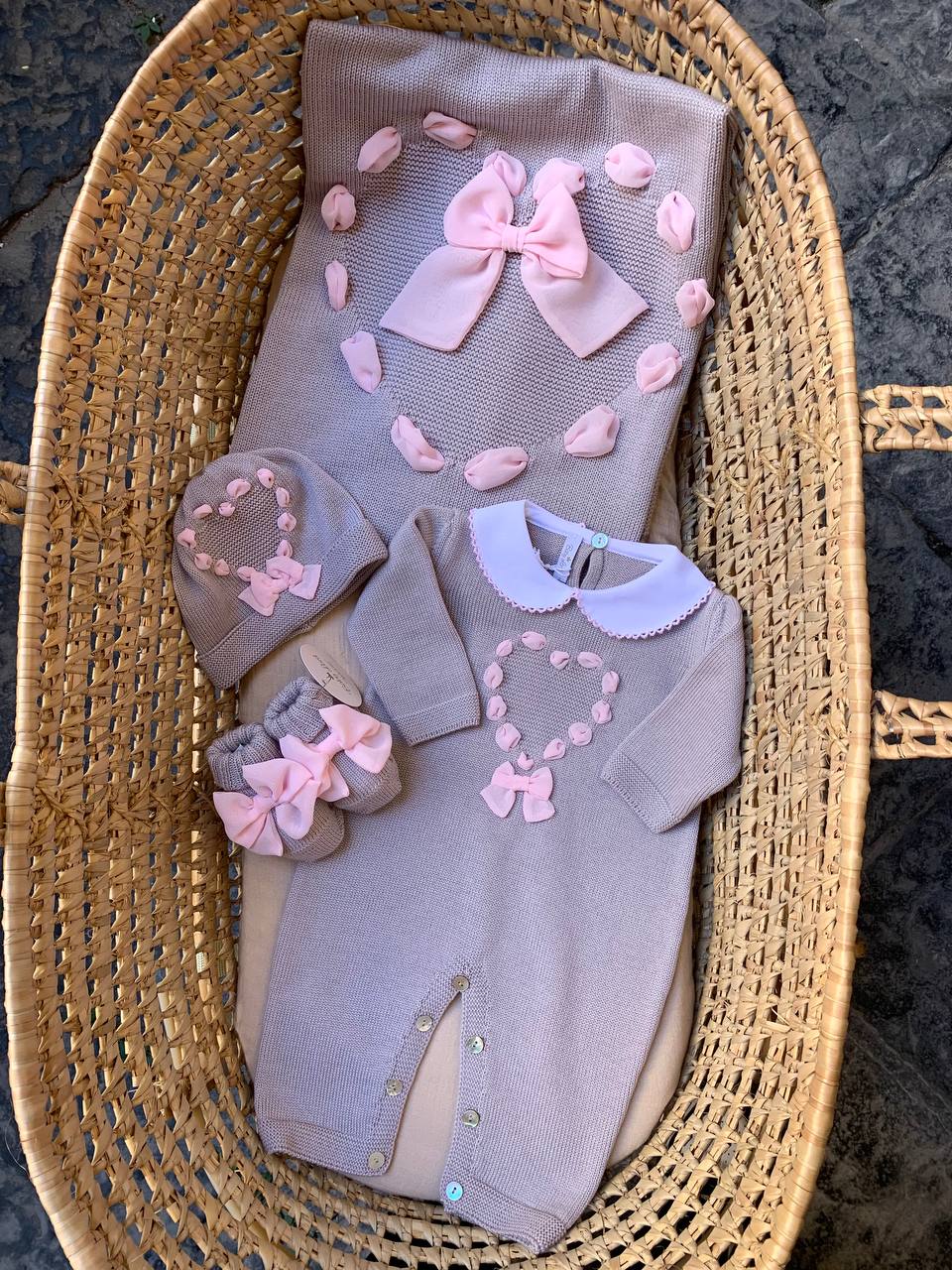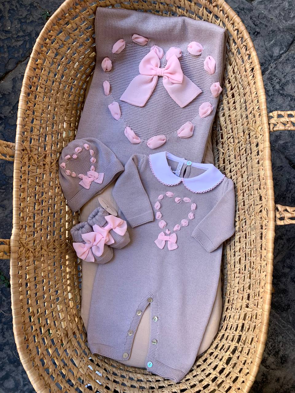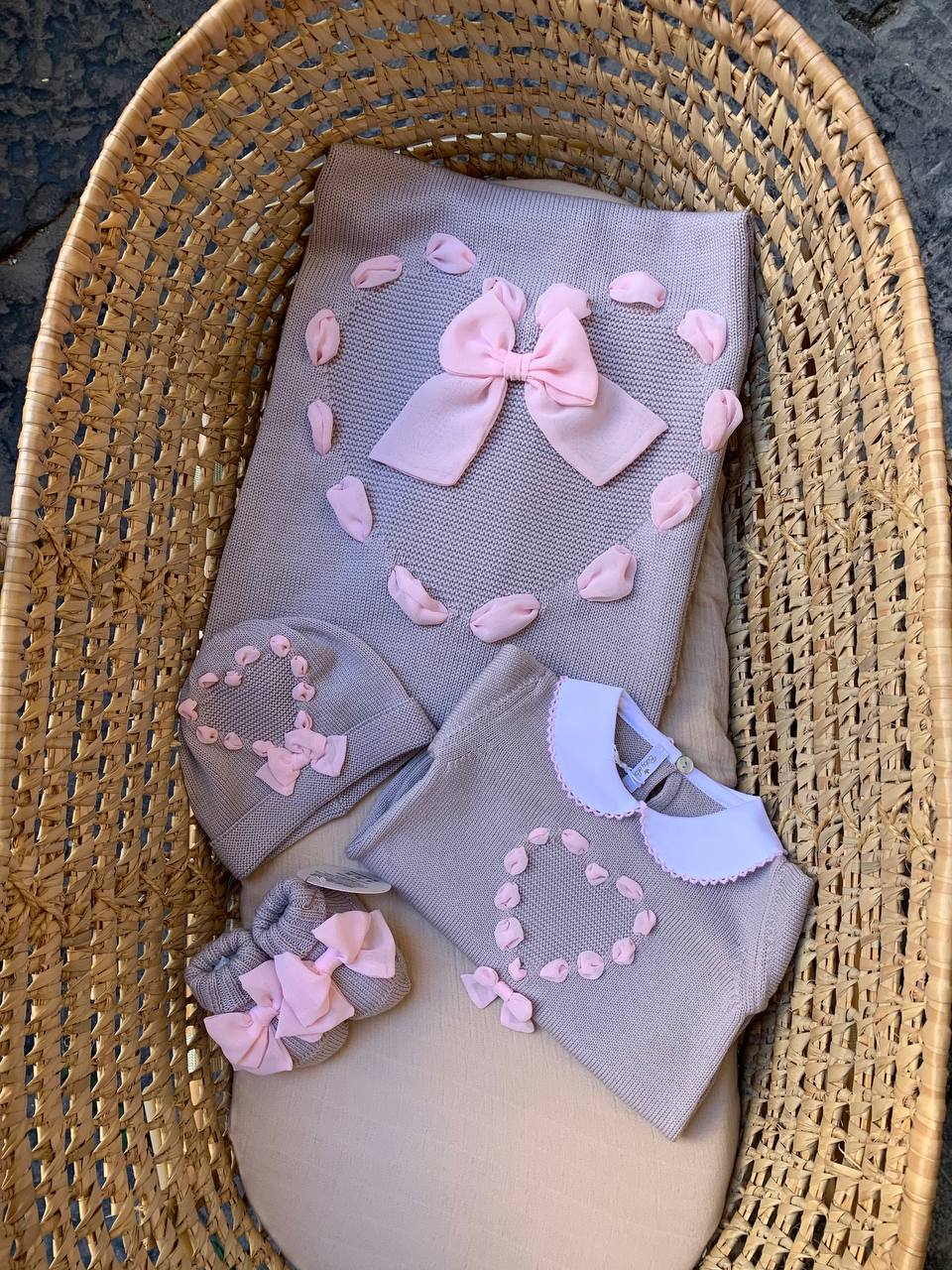 Questo coordinato nascita "Cuore in Cady" in lana è perfetto per un regalo speciale per la neonata. Include una morbida copertina, una comoda tutina, un adorabile cappellino e dolci scarpine, tutti decorati con un delicato cuore. Aggiungi un tocco di calore e amore ai primi mesi del tuo bambino con questo coordinato.