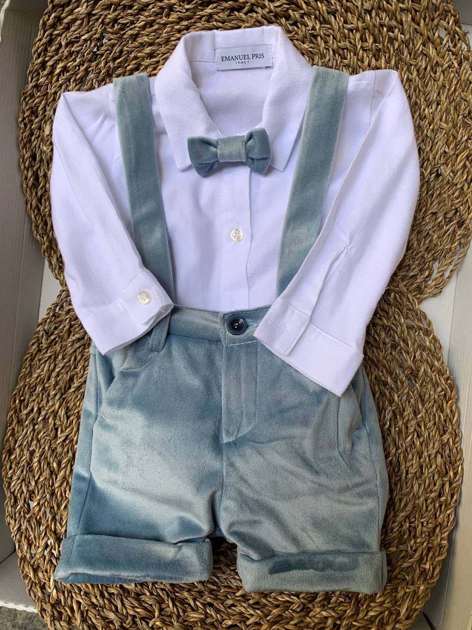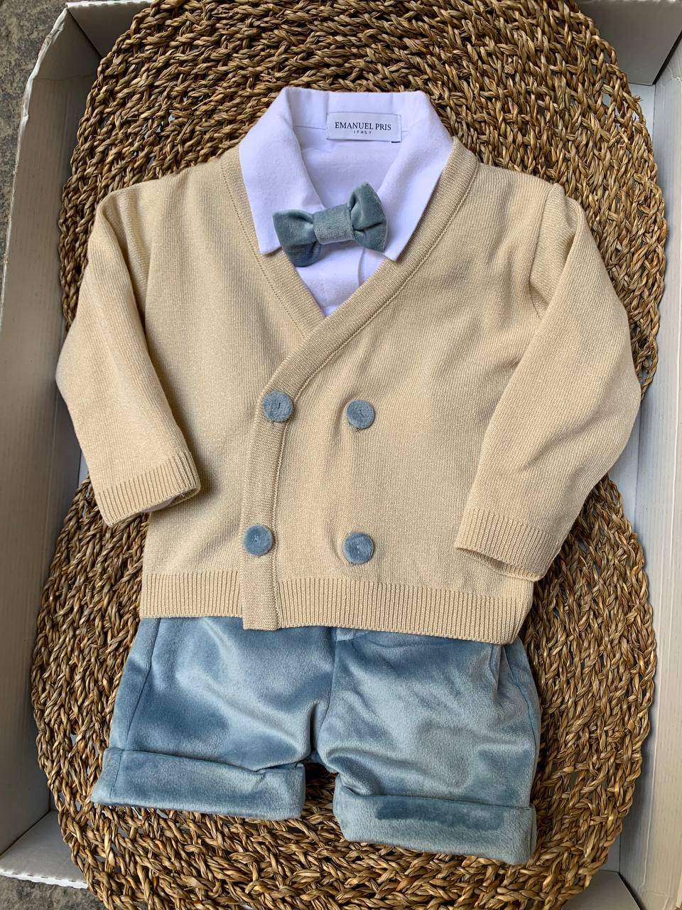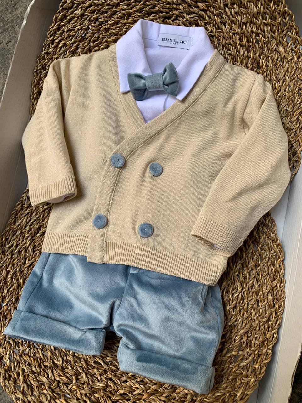Questo coordinato 4 pezzi comprende una salopette, camicia, cardigan e papillon della marca EMANUEL PRIS, perfetto per un neonato in occasione di una cerimonia. Realizzato in delicato colore Ivory e Cielo, offre un look elegante e sofisticato per il tuo piccolo. Ideale per sorprendere in ogni occasione importante.