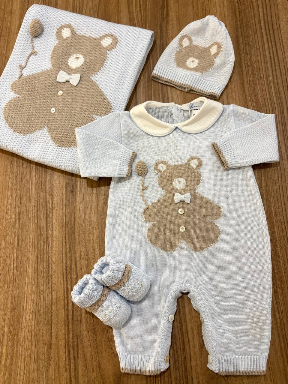 Il Coordinato nascita CIELO E TORTORA AURORA offre un insieme completo per i neonati, comprendente una tutina, una copertina, scarpine e un cappellino, tutti realizzati in filo. Questo set è progettato per garantire comfort e calore, ideale per le delicate esigenze dei neonati.
