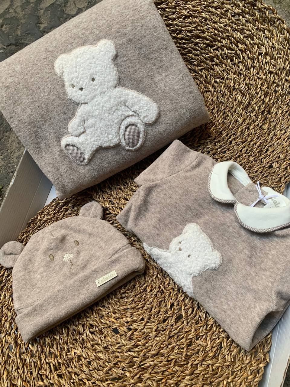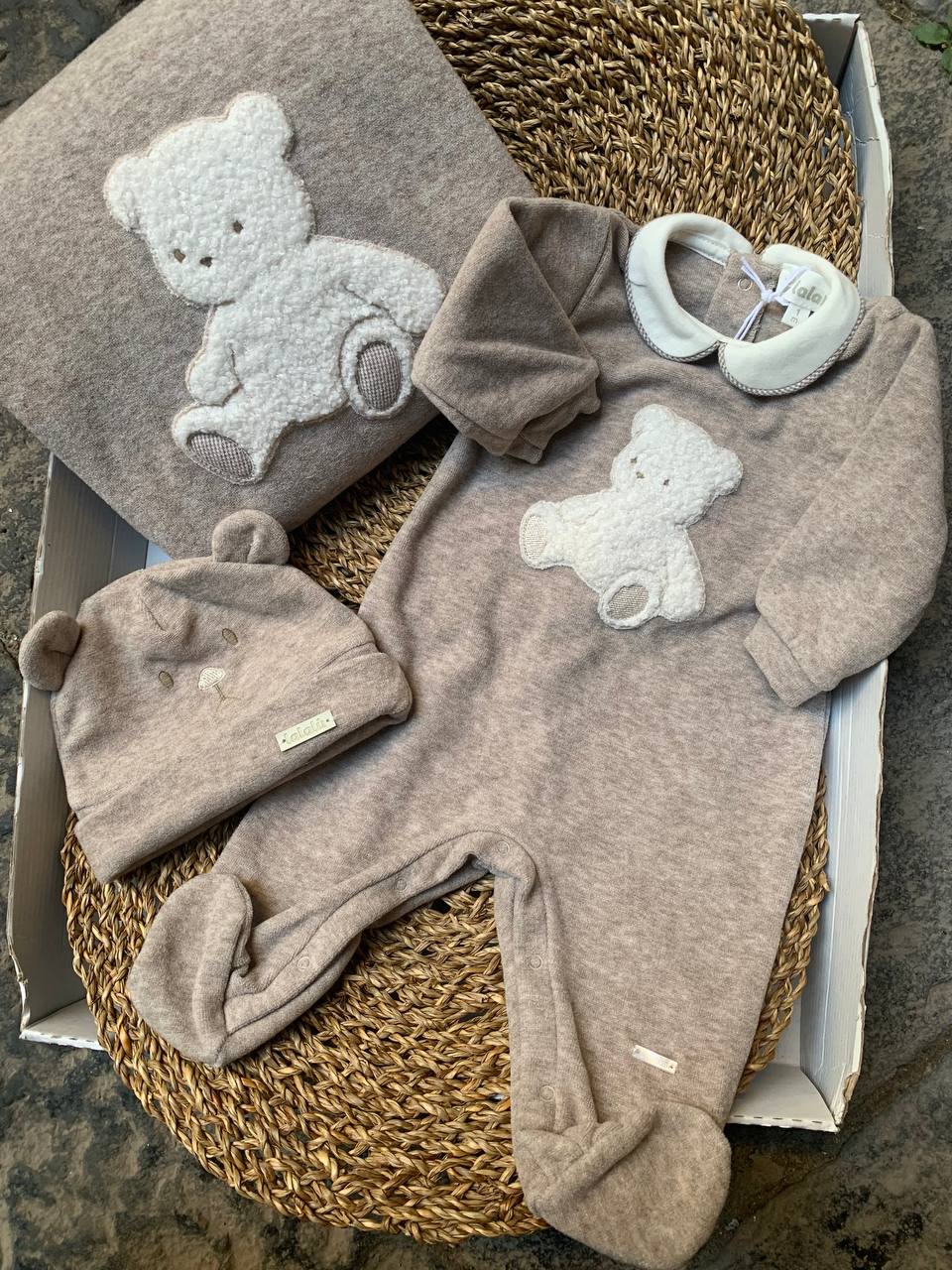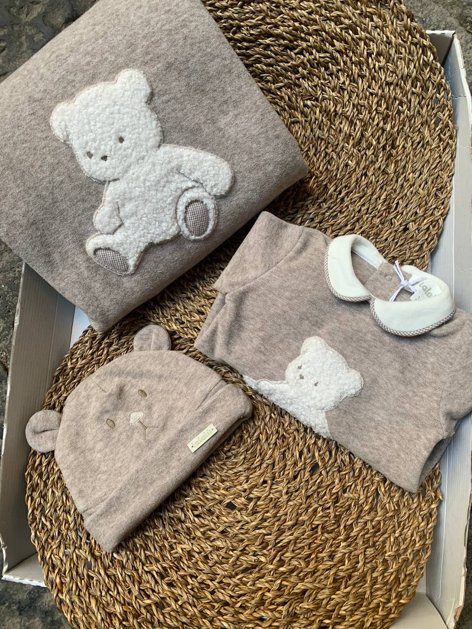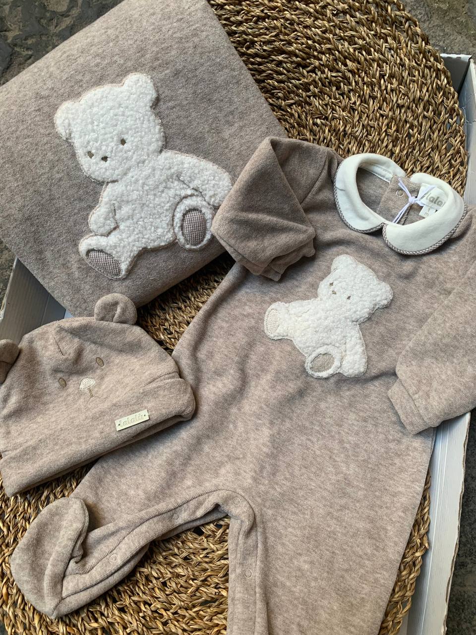 Rendi la nascita del tuo bimbo ancora più memorabile con il coordinato in ciniglia cacao LALALÙ. Include una meravigliosa copertina, una comoda tutina e un adorabile cappellino per neonato. Regala al tuo bimbo il comfort e lo stile che merita con questo set coordinato.