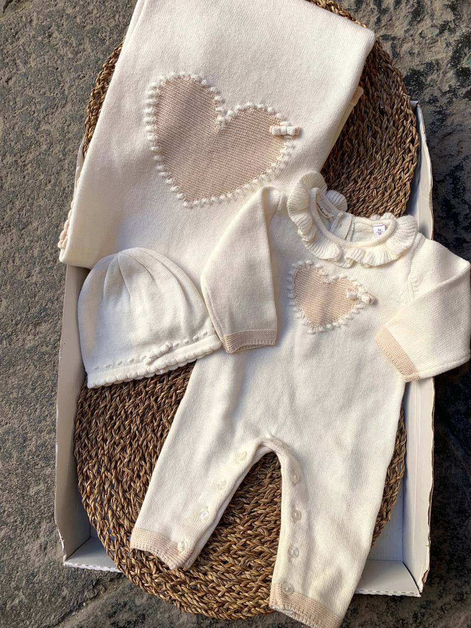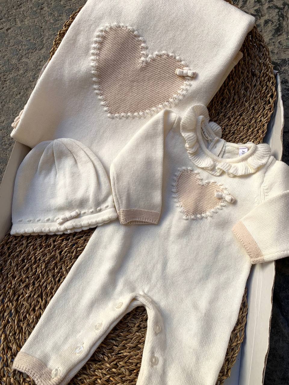 Esclusivo coordinato nascita in panna con cuore e minibanda per neonate. Comprende una morbida tutina, una calda copertina e un adorabile cappellino per garantire il massimo comfort alla tua piccola.Il tocco di cuore rende questo coordinato perfetto per celebrare l'arrivo di un nuovo amore.