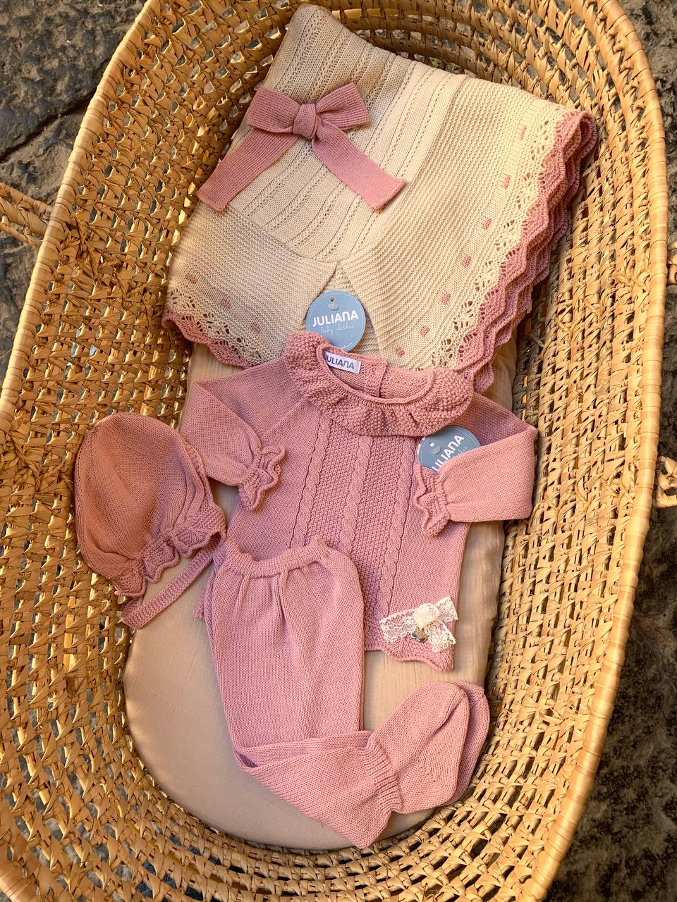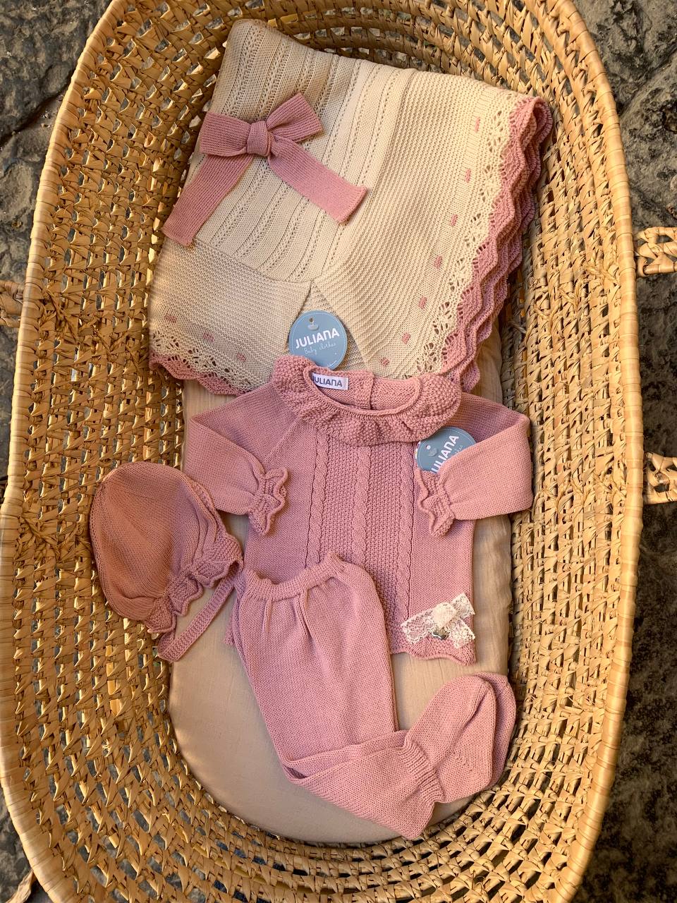 Il coordinato nascita "POESIA" di Juliana è il regalo perfetto per la neonata. Include uno scialle, una tutina spezzata e un cappellino, tutti coordinati per creare un look elegante e confortevole. Realizzato con materiali di alta qualità , questo coordinato garantisce il massimo comfort per la bambina e un'adorabile presentazione.