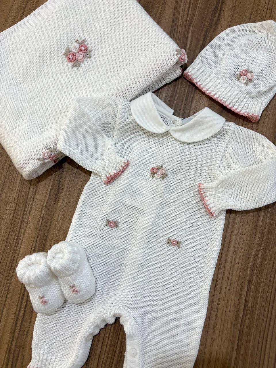 Il coordinato nascita ROSELLINE LATTE E ROSA AURORA è progettato per offrire comfort e stile alla neonata. Comprende una copertina, una tutina, un cappellino e scarpine, tutti realizzati con materiali delicati e sicuri. Questo set è ideale per mantenere la temperatura corporea e garantire il benessere della pelle sensibile dei neonati.