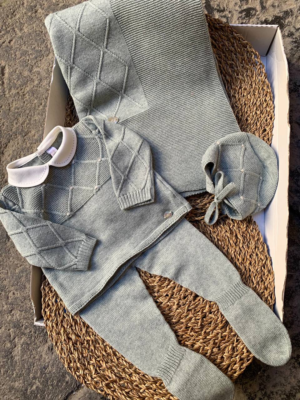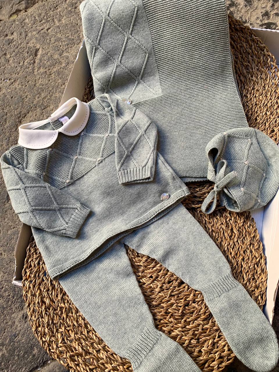 Questa adorabile Coordinato nascita verde MartinAranda per neonato comprende una tutina spezzata con cappellino e scialle. Realizzato con materiali di alta qualità , tiene il tuo bambino al caldo e confortevole durante i suoi primi giorni di vita. Perfetto per una presentazione elegante e un regalo di benvenuto.