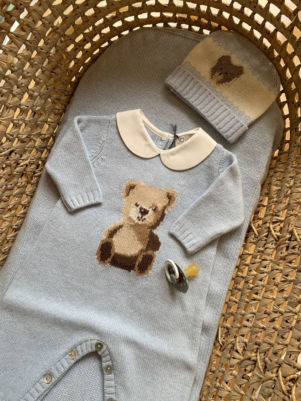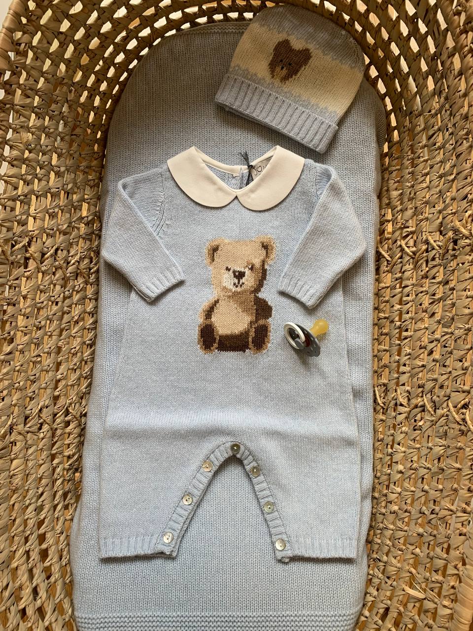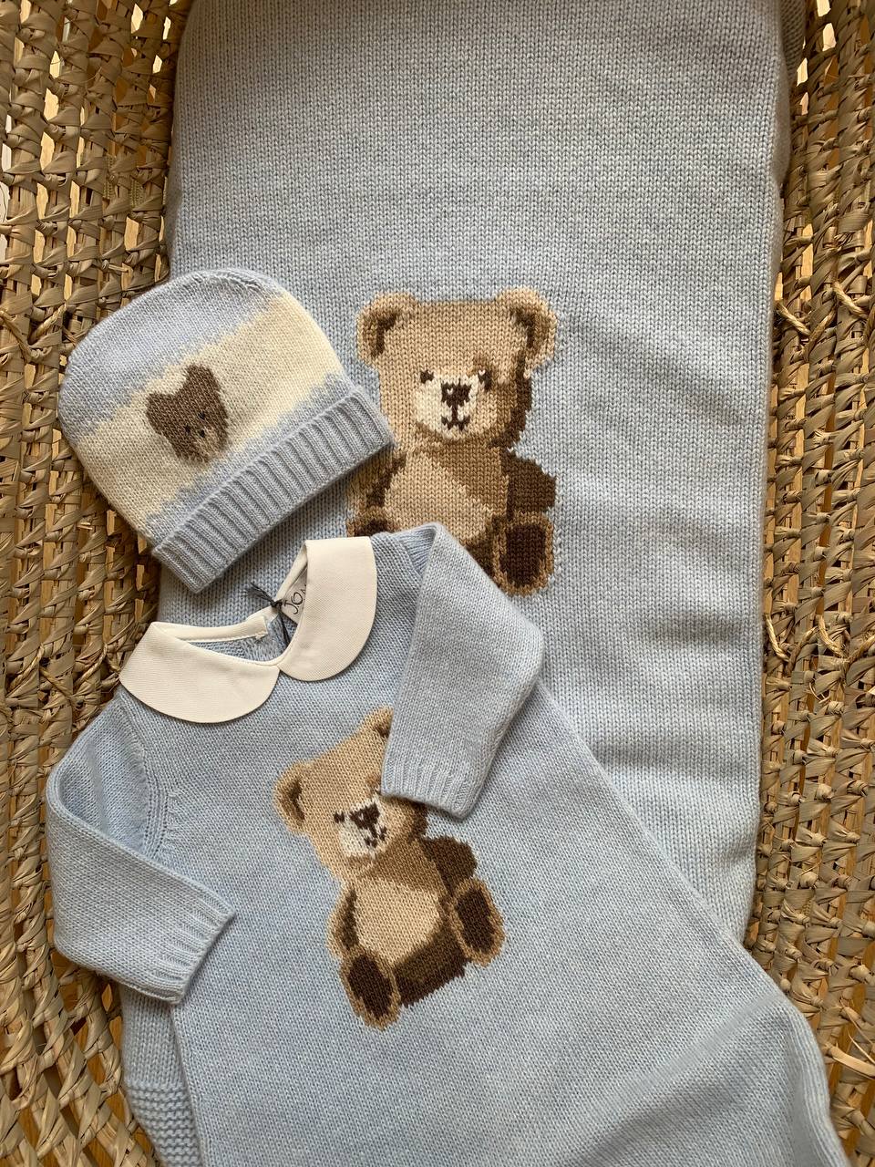 Coordinato Orso Jo Milano è il set perfetto per il tuo piccolo esploratore. La tutina, lo scialle e il cappellino con il tenero orsetto Jo Milano garantiranno il massimo comfort e stile. Realizzato con materiali di alta qualità , questo coordinato è ideale per ogni occasione.Lana 100% made in Italy.