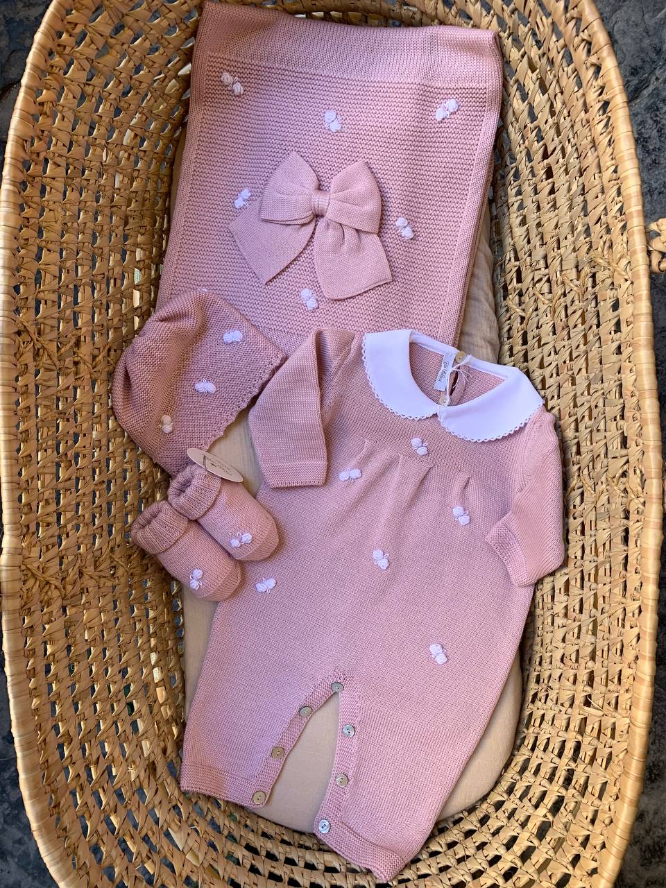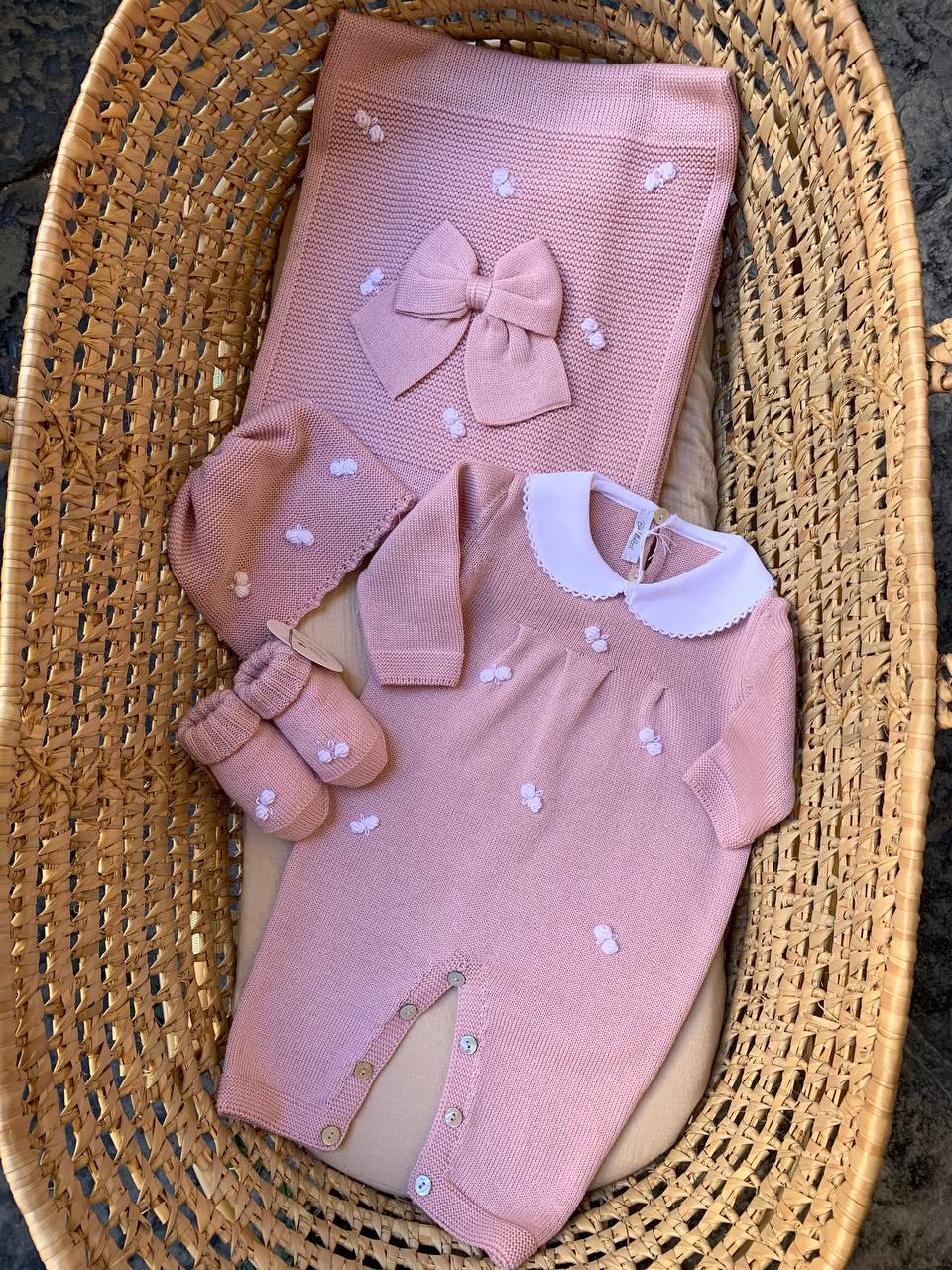 Con il Coordinato Roselline la tua neonata sarà avvolta in morbida lana fin dal primo giorno. Il set comprende una copertina, tutina, scarpine e cappellino, perfetti per mantenere il tuo piccolo angelo al caldo e al sicuro. Un regalo ideale per celebrare la sua nascita.