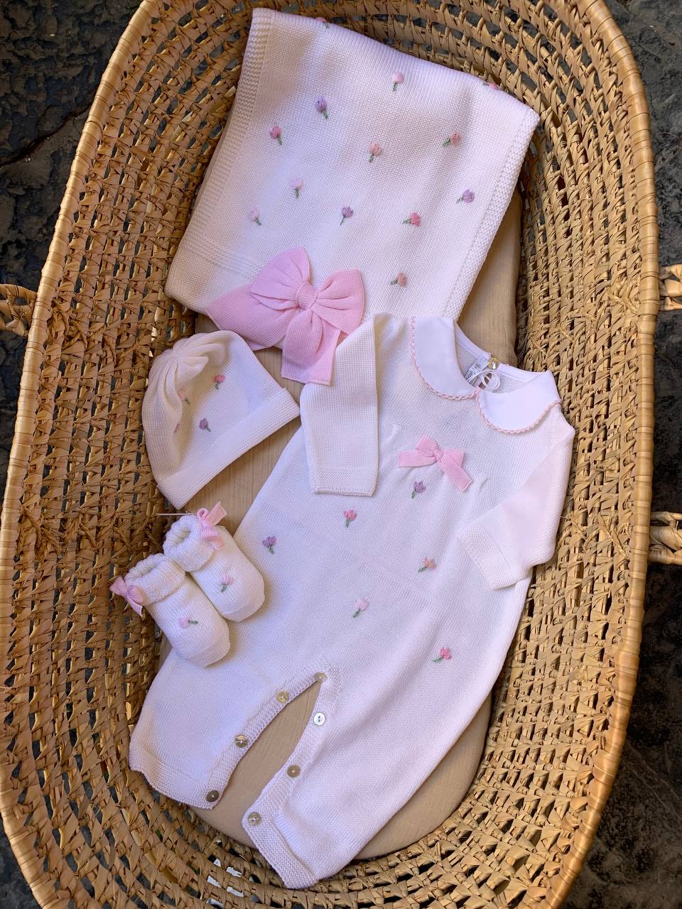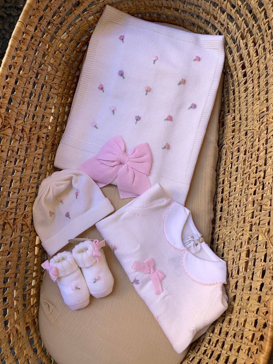 Ottenete il coordinato perfetto per la nascita della tua neonata! Il set in lana Coordinato Tulipani comprende una tenera copertina, una comoda tutina, adorabili scarpine e un cappellino. Facile da indossare e morbido sulla pelle del tuo piccolo, il coordinato tulipani la terrà calda e protetta in ogni momento.