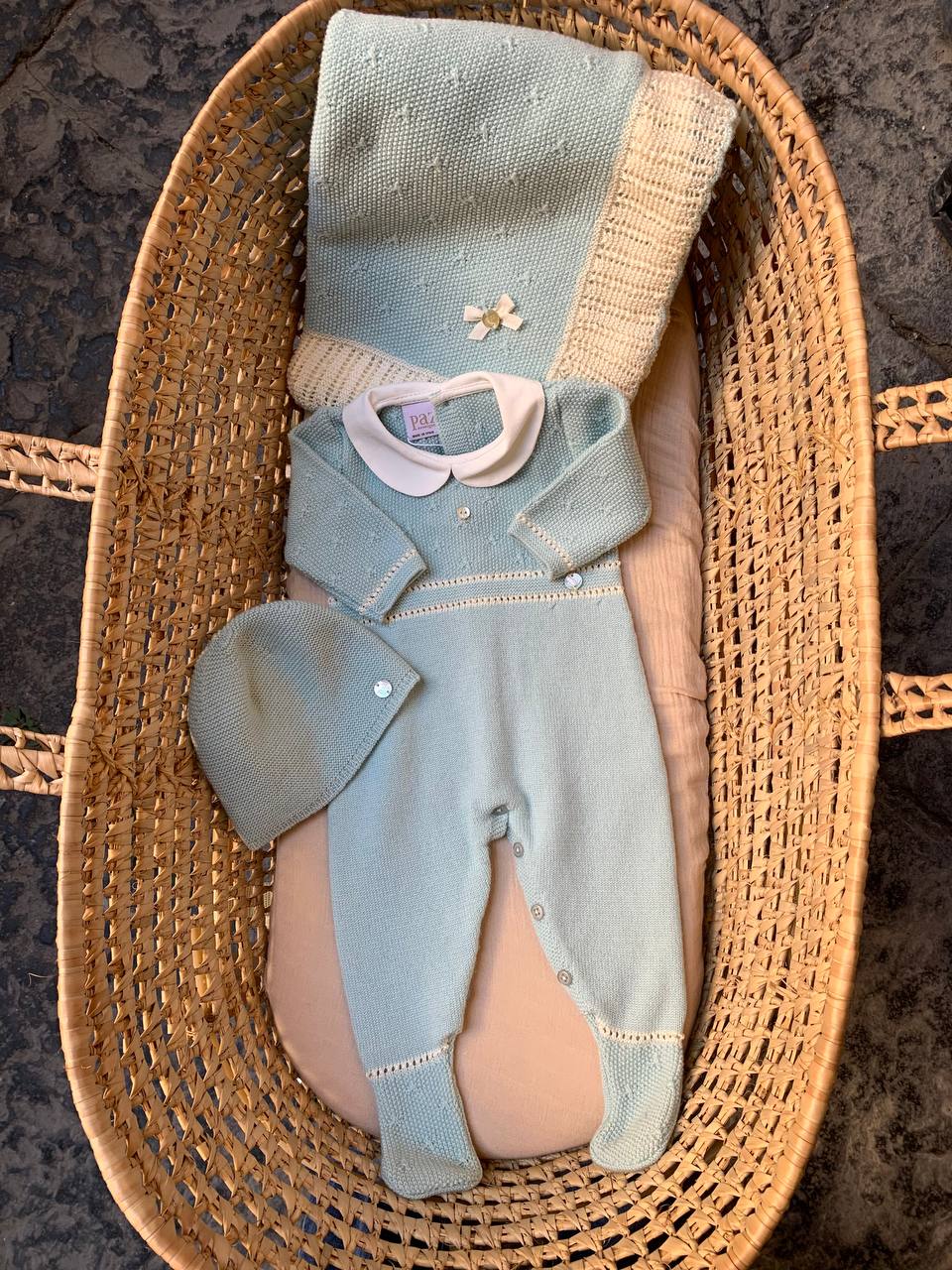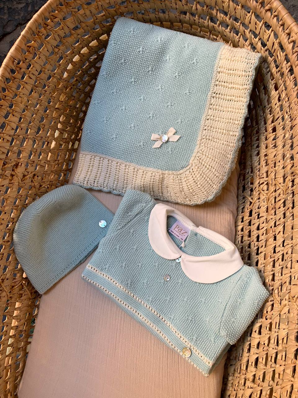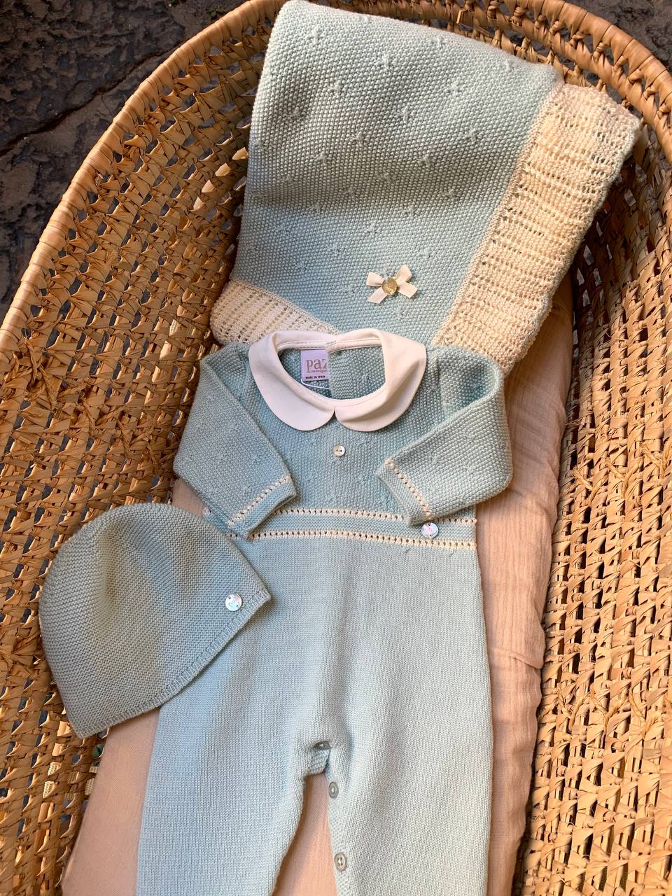 Questo coordinato verde gesso PAZ RODRIGUEZ è perfetto per il tuo bambino. Include una copertina, una tutina e un cappellino in lana per tenere il tuo piccolo al caldo e alla moda. Il tessuto verde gesso è morbido e confortevole sulla pelle sensibile del tuo bambino. Ideale per un look elegante e confortevole.